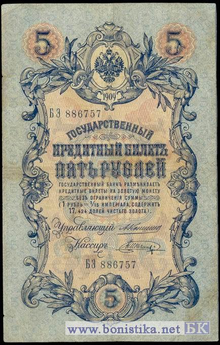 5 рублей 1909 года. А.Коншин-В.Шагин