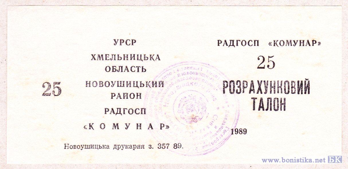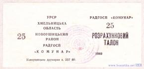 Расчётный талон. УССР, Хмельницкая обл, Новоушицкий р-он, совхоз «Коммунар»