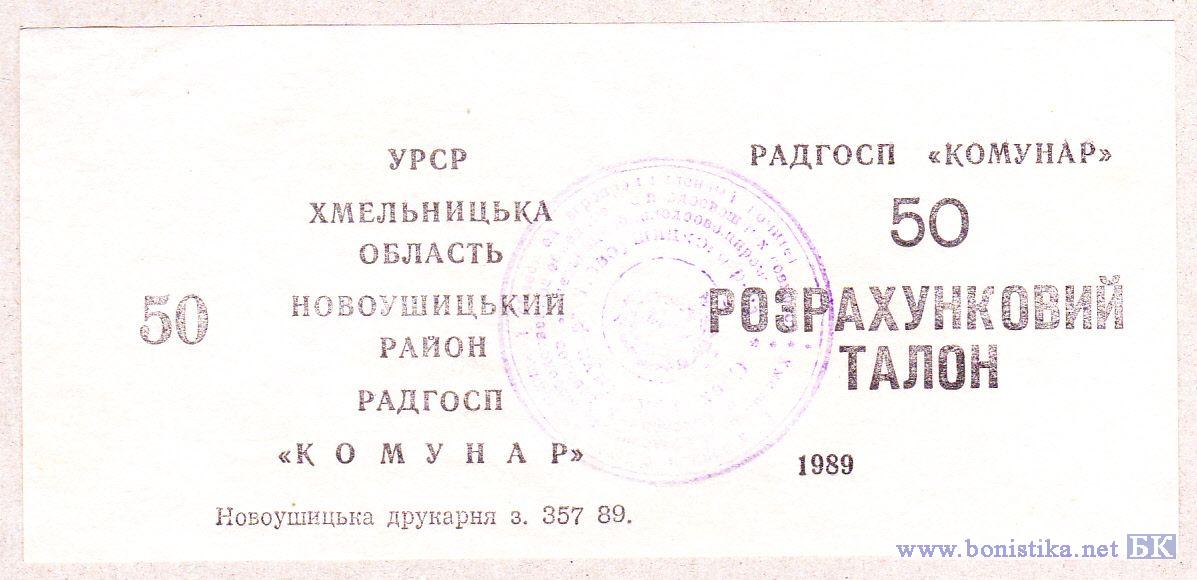 Расчётный талон. УССР, Хмельницкая обл, Новоушицкий р-он, совхоз «Коммунар»