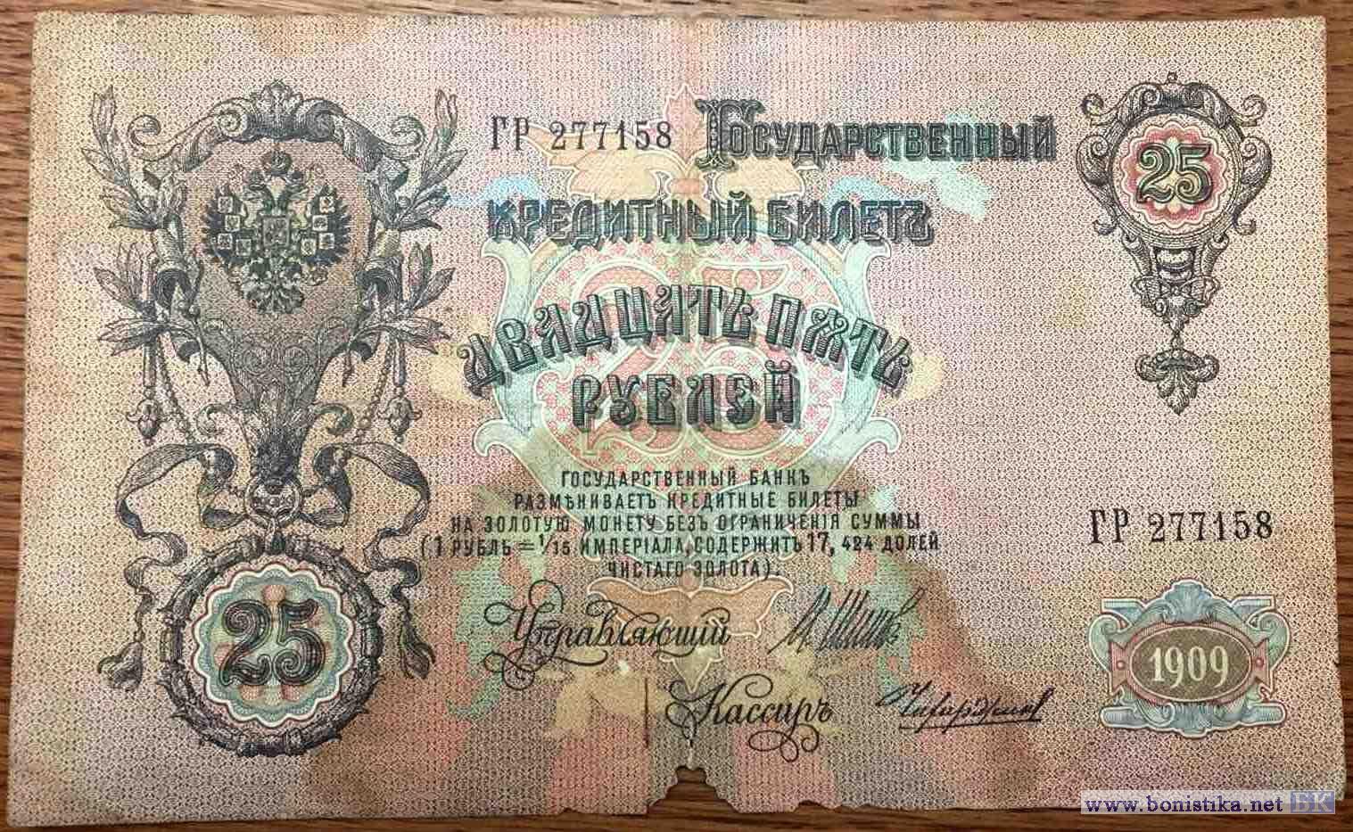 Государственный кредитный билет 25 рублей образца 1909. Автор (авторы) дизайна знака - Р.Г. Заррин. Л.с. Слева декоративный элемент из лавровых веток и лент. В центре герб Российской Империи образца 1883 года. Внизу цифры номинала - 25. Справа гильош с цифрами номинала. Внизу с годом - 1909. В центре текст - ГОСУДАРСТВЕННЫЙ КРЕДИТНЫЙ БИЛЕТ. ДВАДЦАТЬ ПЯТЬ РУБЛЕЙ. Государственный банк разменивает кредитные билеты на золотую монету без ограничения суммы (1 р. = 1/15 империала, содержит 17,424 долей чистого золота). Управляющий. Кассир. О.с. Справа портрет императора Александра III в овальной, с императорской короной, рамке. Внизу ветви, фрукты, якоря. Слева под императорской короной окно для водяного знака. В центре герб Российской Империи образца 1883 года с венком из лавровых ветвей. Ниже номинал - 25 и текст: 1. Размен государственных кредитных билетов на золотую монету обеспечивается всем достоянием государства.