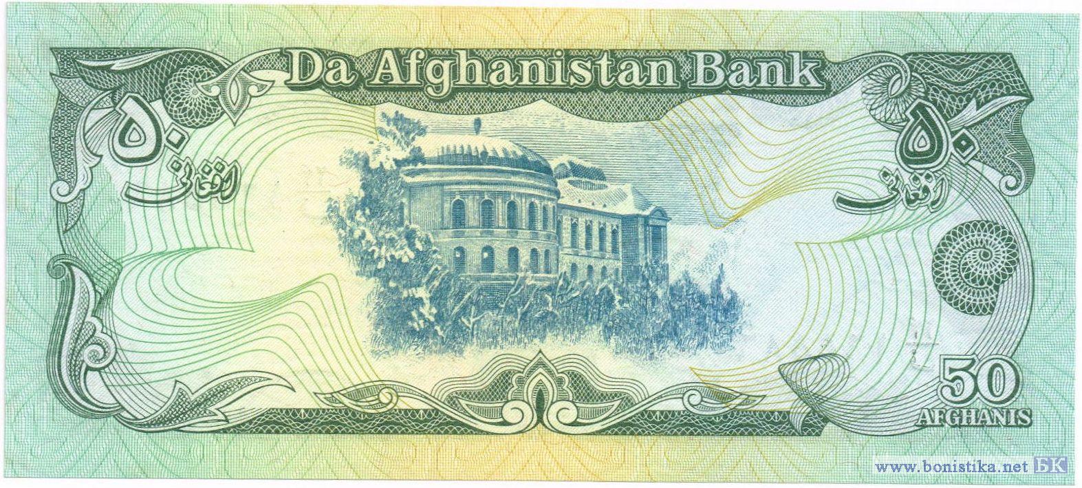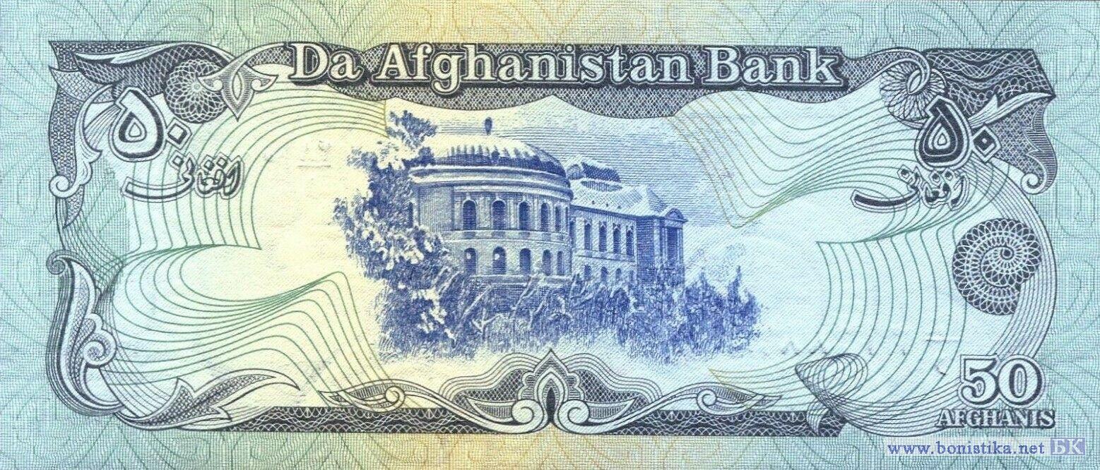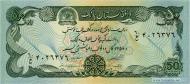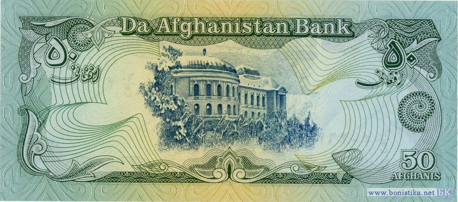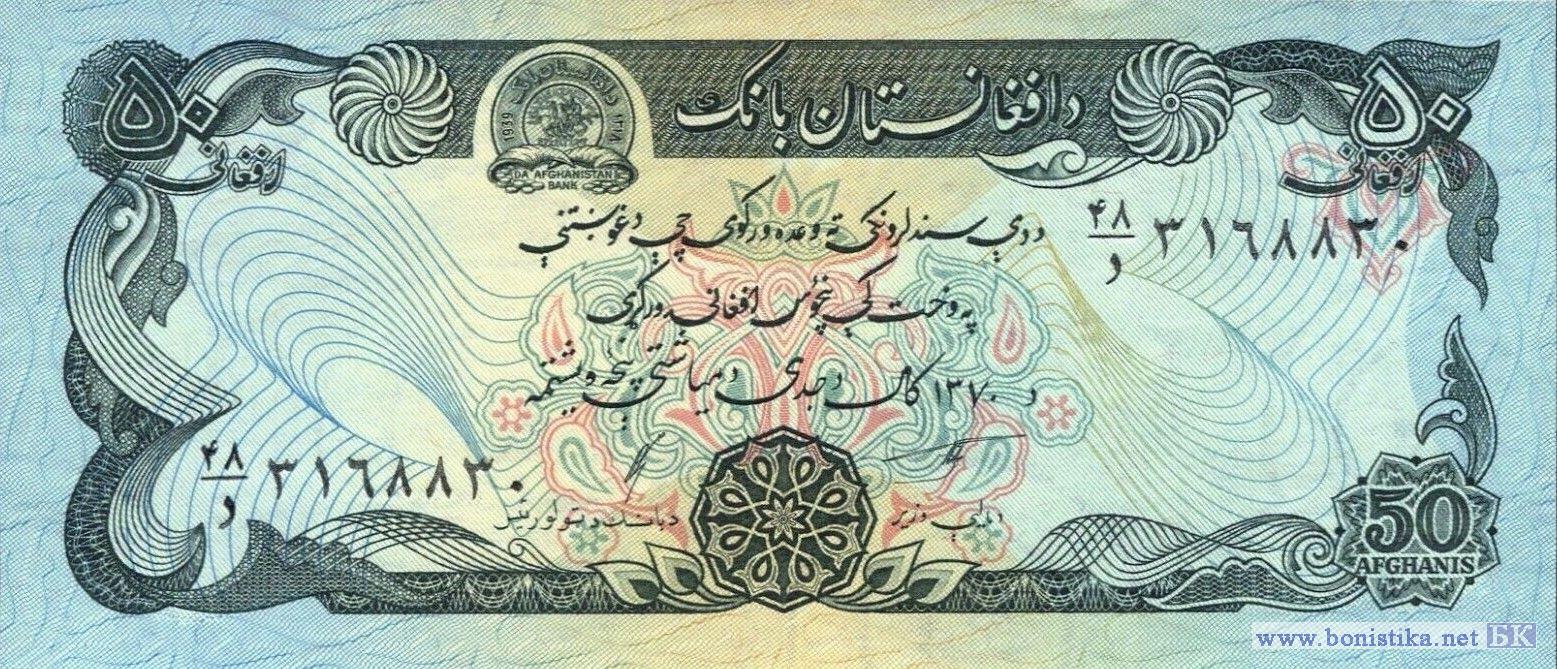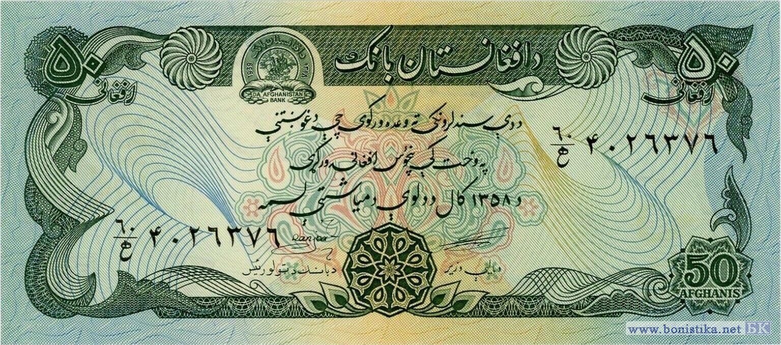 Подписи: Ghulam Hussain Juwaini (глава Центробанка) и Abdul Wakil (министр финансов). Выпущена в обращение 10.12.1980 г. Два варианта: c водяными знаками герб Хальк (от афгани 1978) и эмблема Центроба