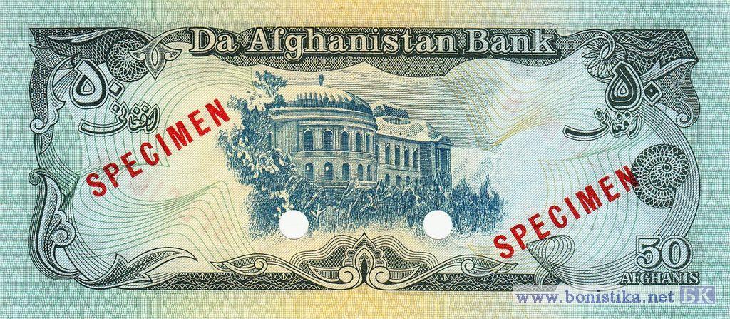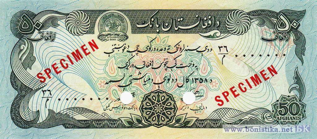 Образец. Подписи: Ghulam Hussain Juwaini (глава Центробанка) и Abdul Wakil (министр финансов). Водяные знаки в виде герба Хальк (от афгани 1978).
