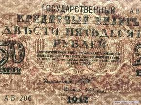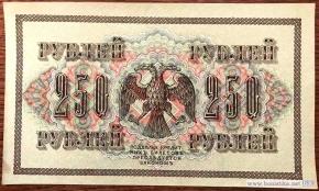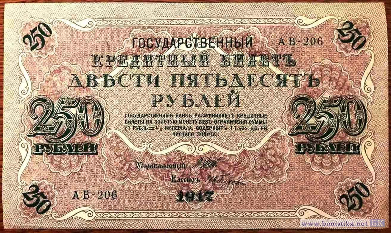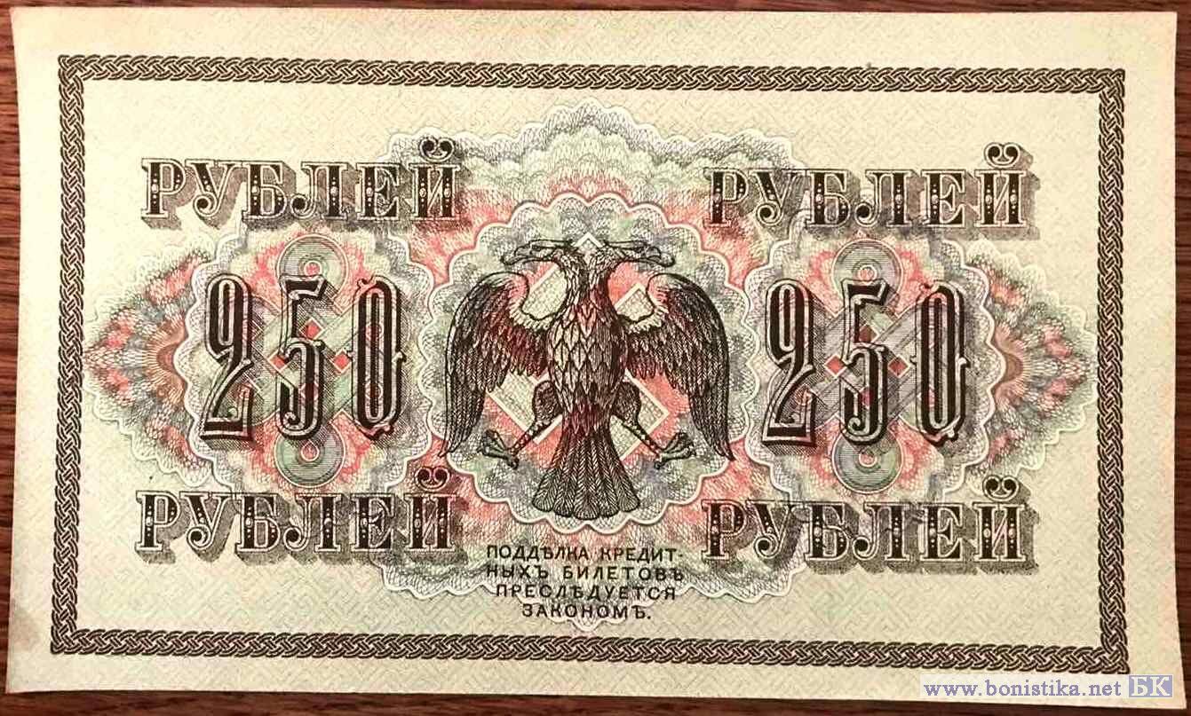 Государственные кредитные билеты образца 1917 г. Выпущены постановлениям Временного правительства от 26 апреля и от 22 aвгycтa 1917 года. На них был помешен новый государственный герб России. В орнаменте билетов использовалась свастика. Нумерация билетов 250 рублей трехзначная серийная. Серии двухлитерные. Каждая серия с одним и тем же номером выпускалась тиражом в 1 миллион экземпляров. Находились в обращении до 1922 г. Народное название билетов - «Думские» или «Думки». В документах времен Гражданской Войны для билетов образца 1917 года также встречается наименование "керенки".