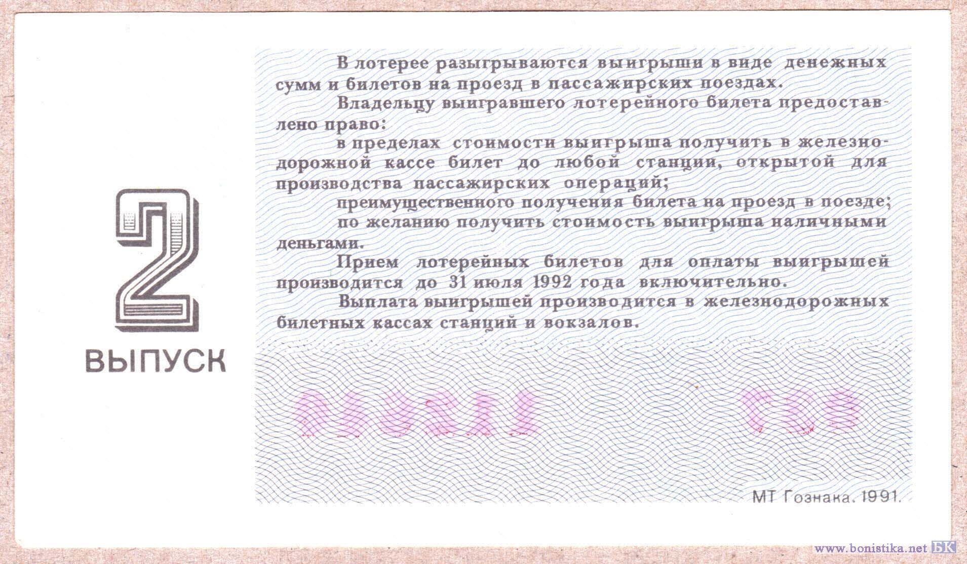 Билет всесоюзной железнодорожной лотереи 1990 года, первый выпуск.