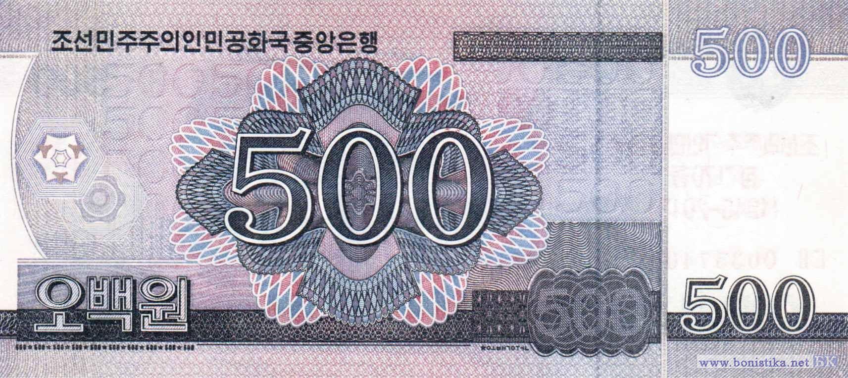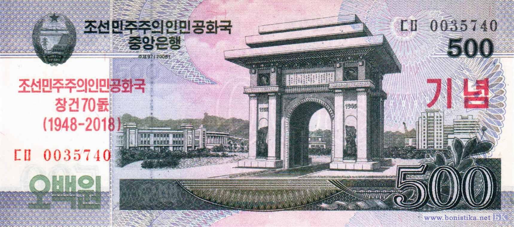 Юбилейная банкнота: 70 лет образования Корейской Народно-Демократической Республики (КНДР). Горы, здания, деревья, Кэсонмун (Триумфальная арка или ворота Триумфа), возведена в 1982 году в городе Пхеньян в честь Корейского сопротивления 1925 – 1945 годов против японских оккупантов, к 70-летнему юбилею президента Ким Ир Сена.
