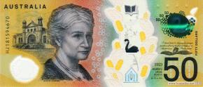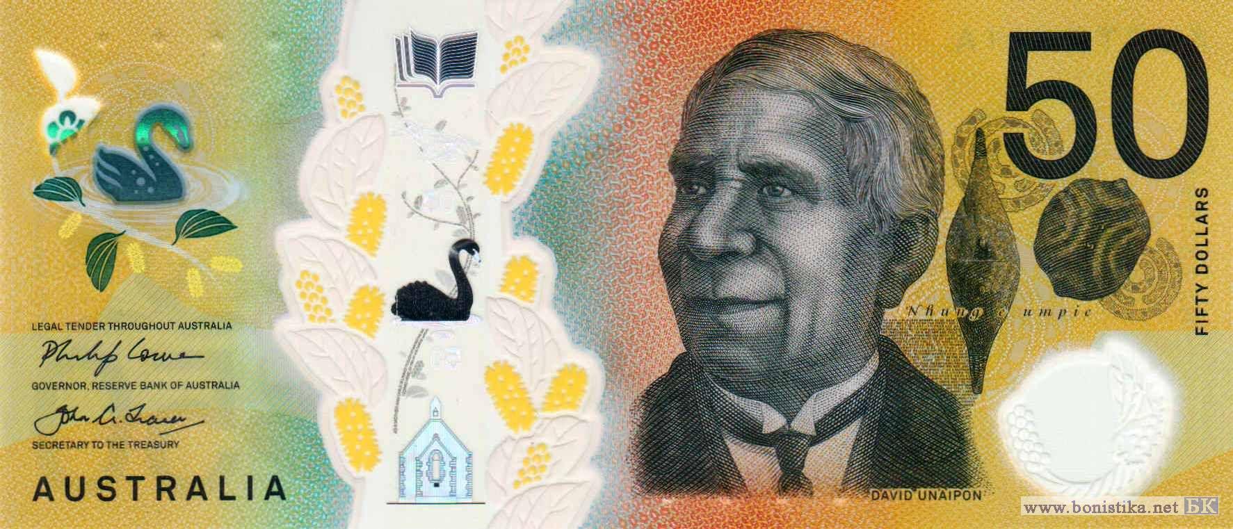 Ветви с листьями и соцветиями акации гумифузы (Acacia humifusa) – кустарникового дерева семейства бобовых, чёрные лебеди (Cygnus atratus) – птицы семейства утиных, проповедник, изобретатель, писатель, журналист Дэвид Юнайпон, щиты народа нгарринджери. Фрагмент фасада здания Мемориальной больницы короля Эдуарда для женщин в городе Субиако, политик, феминистка Эдит Коуэн, боролась за права женщин и детей, брошь в виде листьев и ореха.
