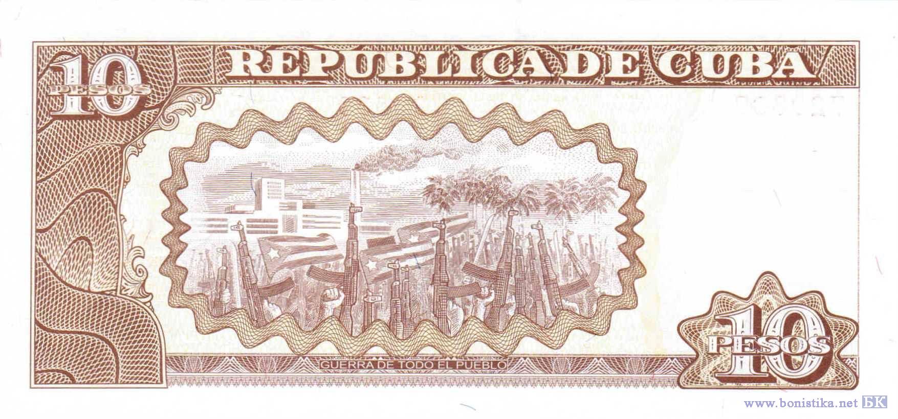 Один из руководителей антиколониального восстания 1895 года, военачальник повстанцев, генерал Максимо Гомес и Баэс. Здания и сооружения, руки с автоматами и флаги Кубы – символы войны всего народа, пальмы.
