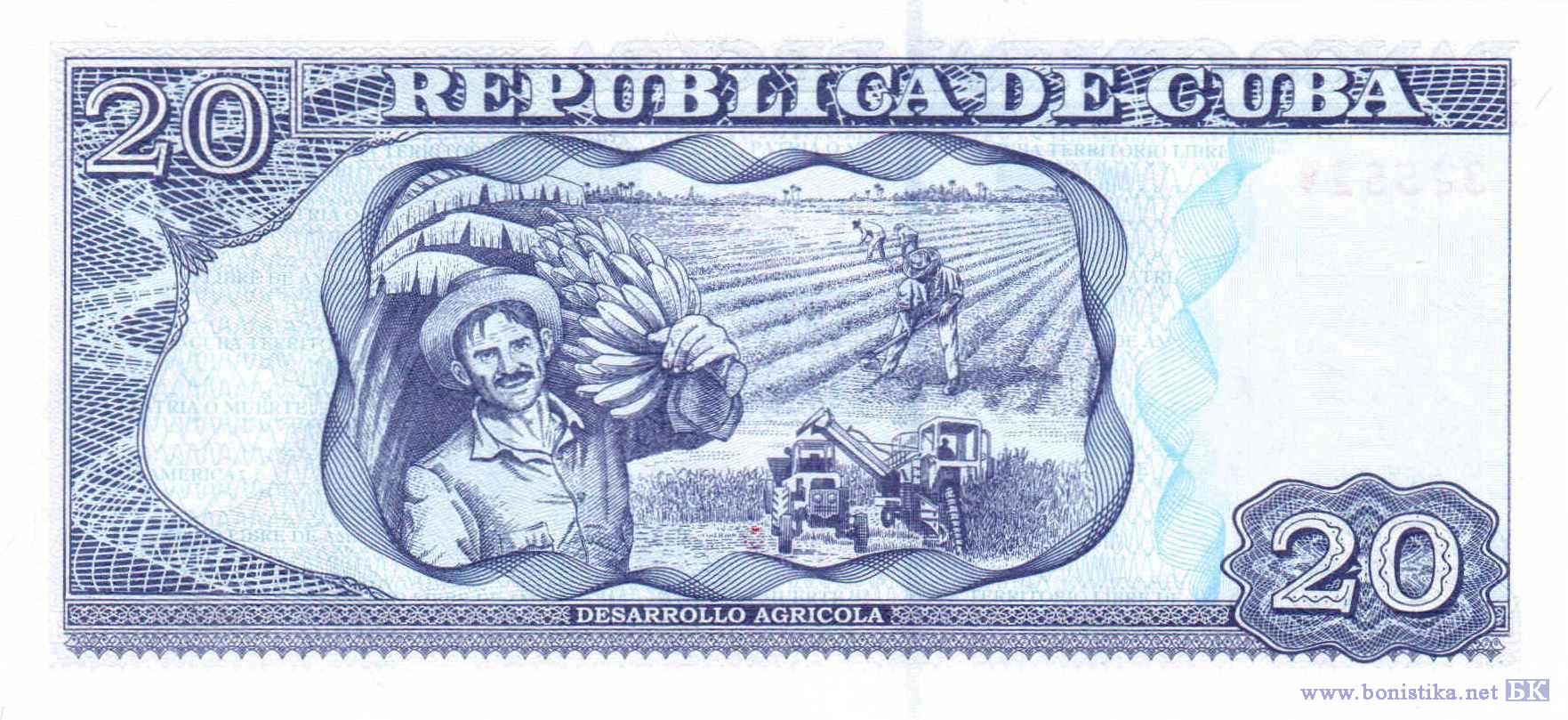 Национальный герой, революционер, команданте (майор) партизанской колонны «Антонио Масео», командующий революционными вооруженными силами Камило Сьенфуэгос Горриаран. Сборщик урожая бананов, крестьяне в поле на прополке, трактор и зерноуборочный комбайн – символы развития сельского хозяйства.