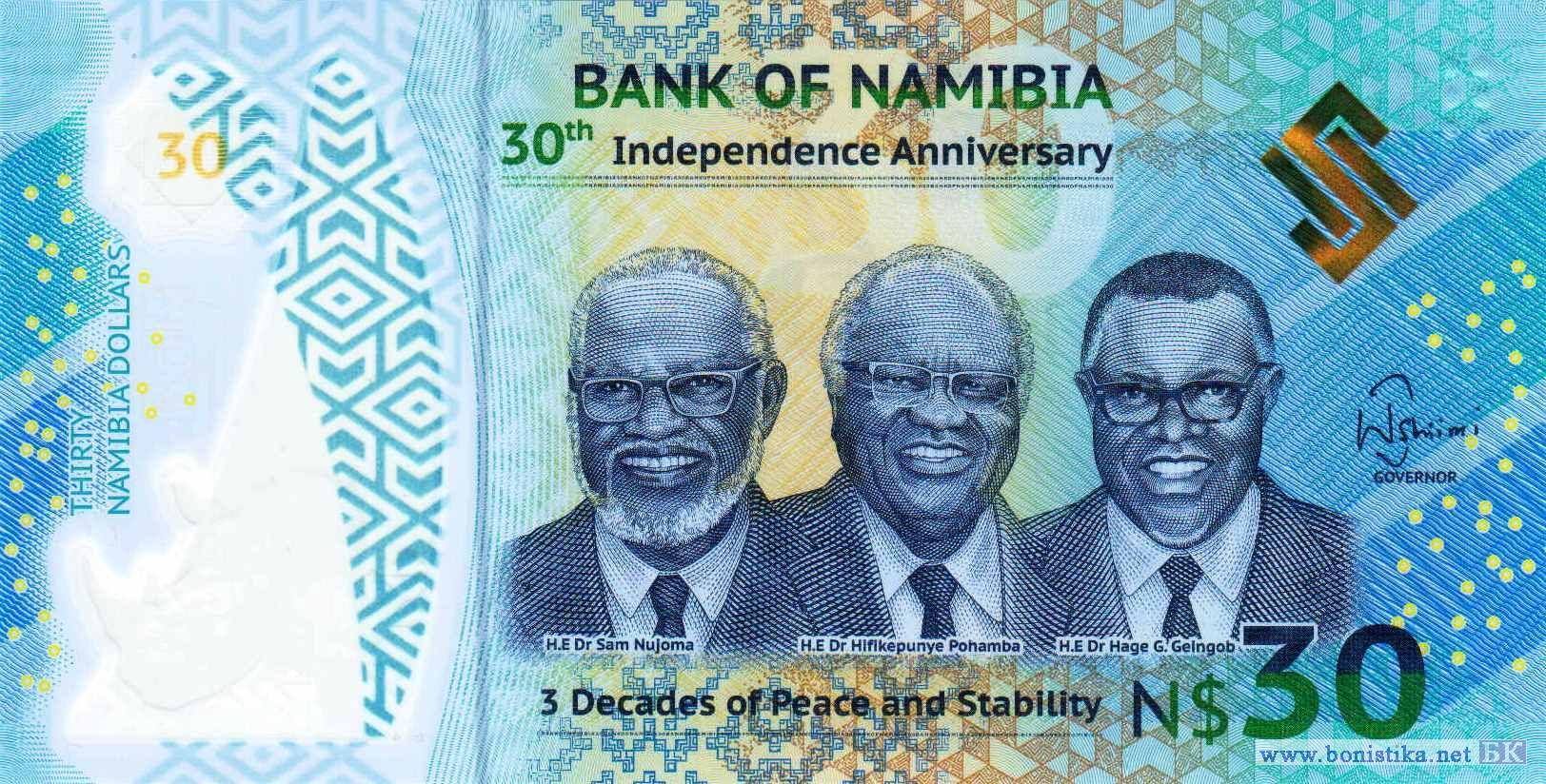 Юбилейная банкнота: 30 лет независимости. Председатель партии СВАПО, первый президент Сэмюэль Дэниел Шафиишуна Нуйома, президенты Хификепунье Лукас Похамба и Хаге Готтфрид Гейнгоб. Горы, намибийские чёрные носороги (Diceros bicornis bicornis) - непарнокопытные млекопитающие семейства носороговых.