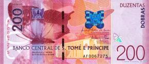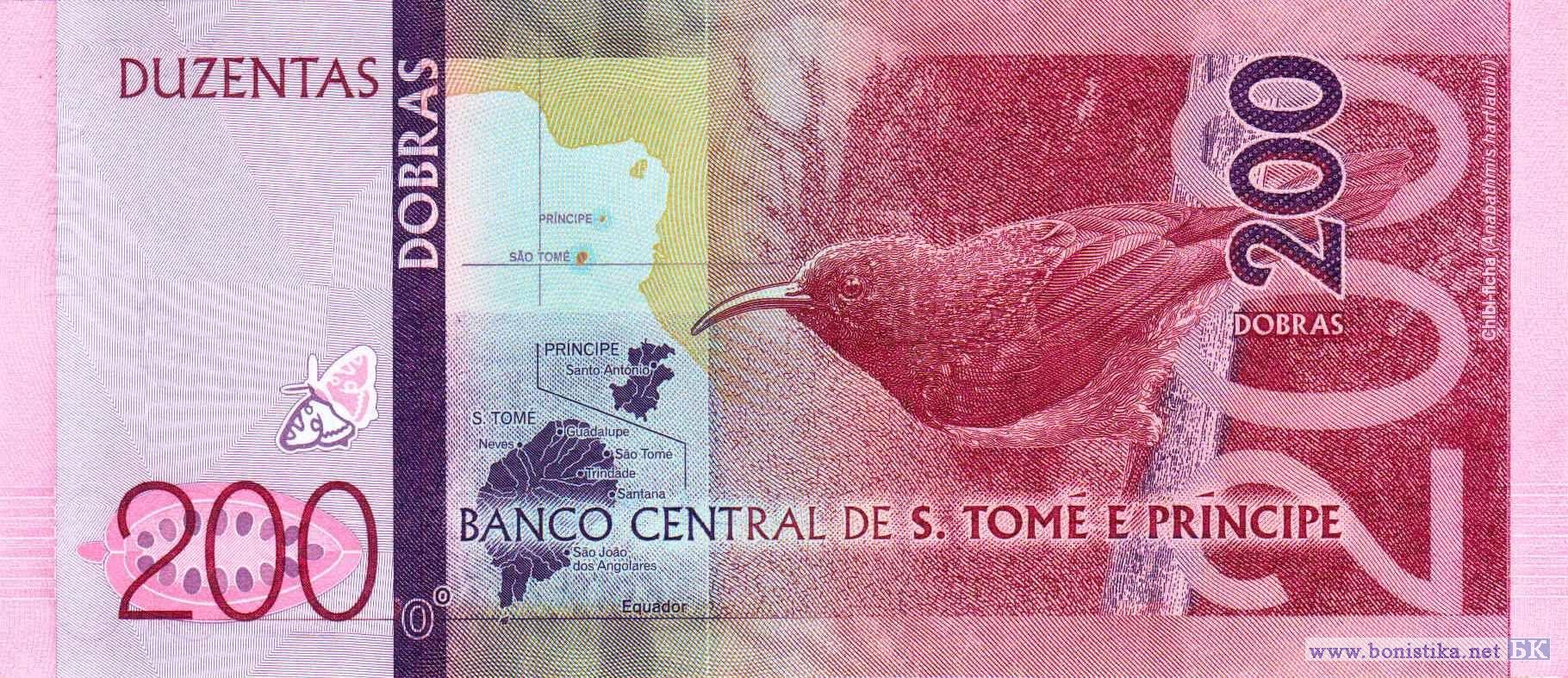 Бабочка харакс дефулвата (Charaxes defulvata) - чешуекрылое насекомое семейства нимфалид, здание центрального банка в городе Сан-Томе. Продольный разрез плода какао или шоколадного дерева (Theobroma cacao) - вечнозеленого дерева семейства мальвовых, карта Сан-Томе и Принсипи, нектарница Хартлауба (Anabathmis hartlaubii) - воробьинообразная птица семейства нектарницевых.