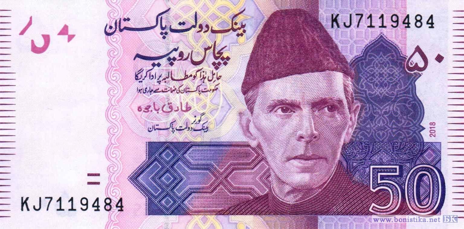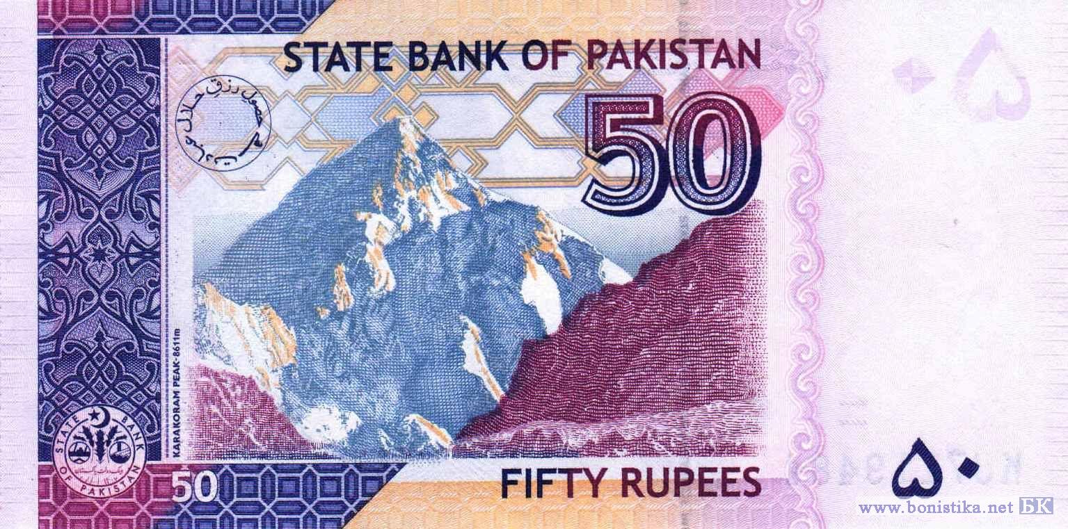 Лидер партии Мусульманская лига, первый генерал-губернатор Мухаммад Али Джинна. Эмблема государственного банка, гора Чогори (К2 или Дапсанг) - высочайшая вершина в горном массиве Каракорум.