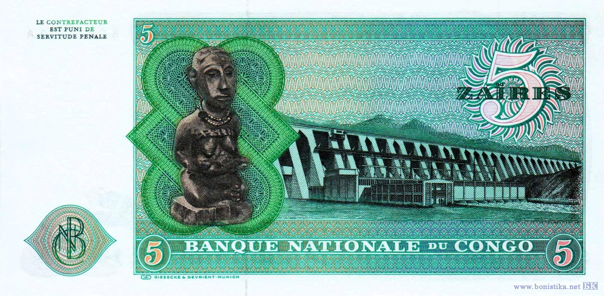 Президент, маршал Мобуту Сесе Секо Куку Нгбенду ва за Банга (Жозеф-Дезире Мобуту), африканский леопард (Panthera pardus pardus) - хищное млекопитающее семейства кошачьих. Монограмма национального банка, статуэтка сидящей женщины, плотина ГЭС Инга I на реке Конго, горы.