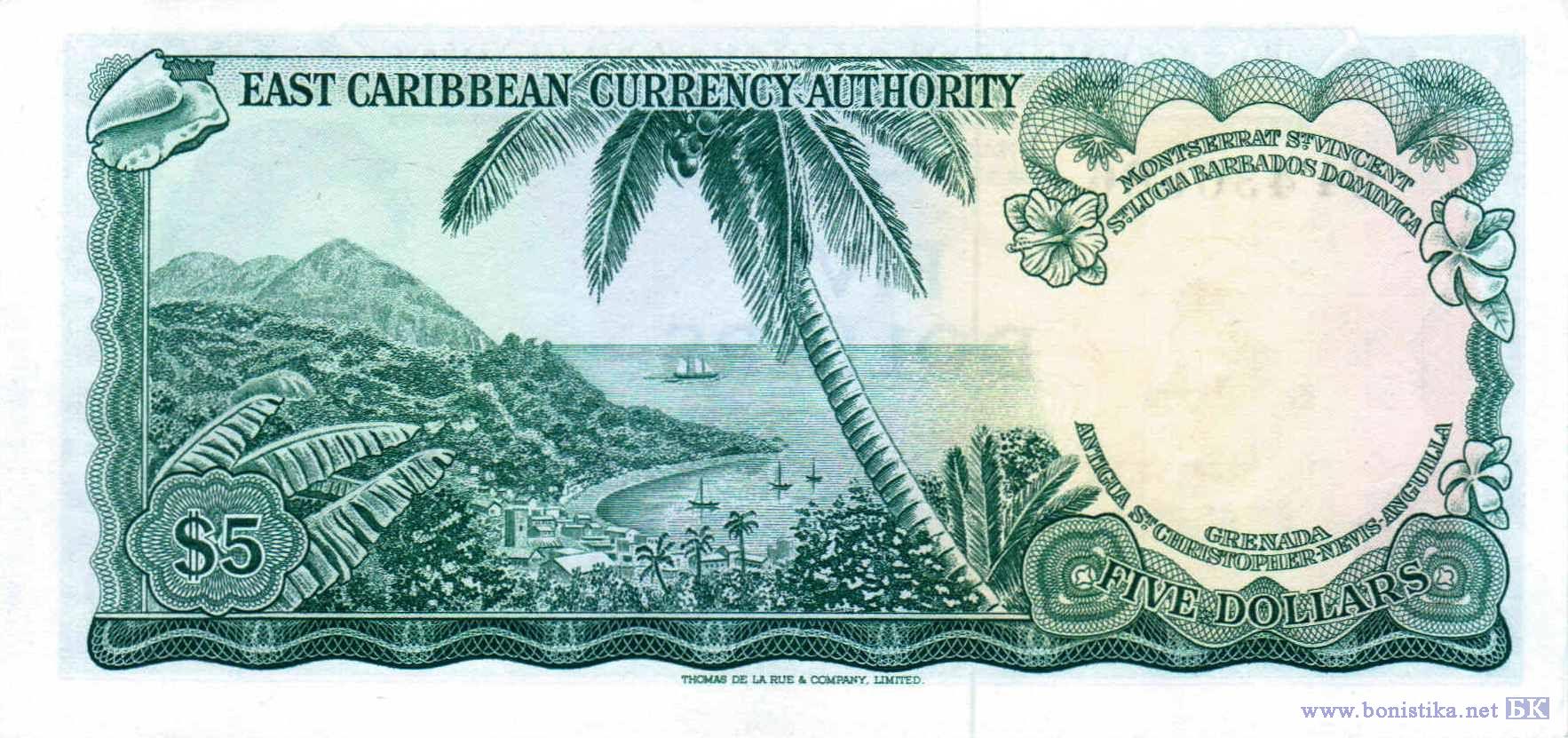 Карта Наветренных и Подветренных островов, летучие рыбы, королева Великобритании Елизавета II. Раковина моллюска, горы, пальмы, здания, парусные суда у побережья острова Сент-Люсия, цветы.