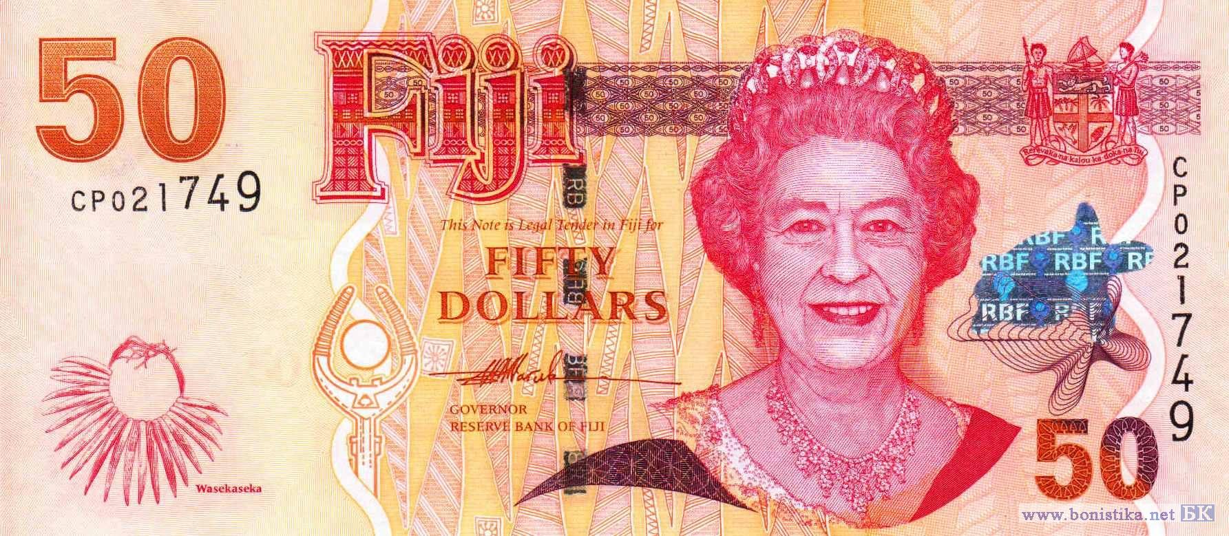 Васекасека – ожерелье из зубов карликового кашалота, домедоме – верхняя часть мачты каноэ, королева Великобритании Елизавета II. Горы, пальма, хижина, участники традиционных ритуальных церемоний тубетубе (табуа) и якона вакатурага (церемония употребления опьяняющего напитка кавы), домедоме – верхняя часть мачты каноэ, логотип Резервного банка.