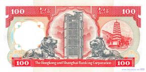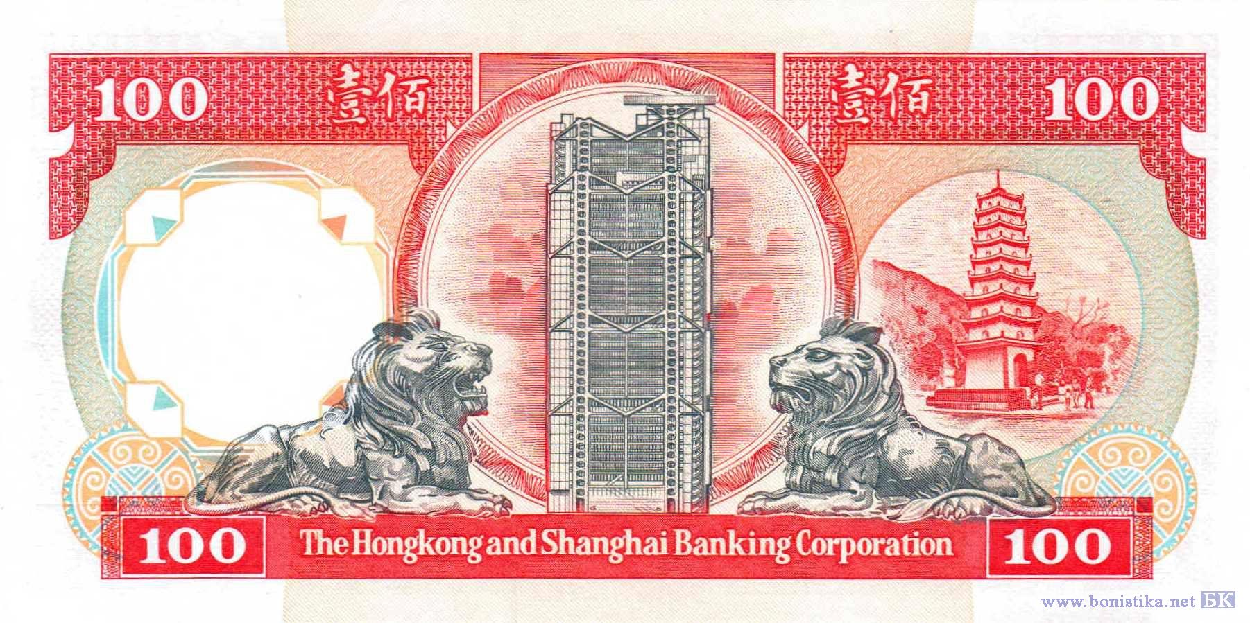 Первый вариант колониального герба Гонконга, логотипы банковской корпорации. Статуи львов у входа в новое здание штаб-квартиры банковской корпорации, новое здание штаб-квартиры банковской корпорации в районе Сентрал в городе Сянган (Гонконг), гора, деревья, пагода Тигра в саду Тигрового бальзама в районе Тайхан в городе Сянган (Гонконг).