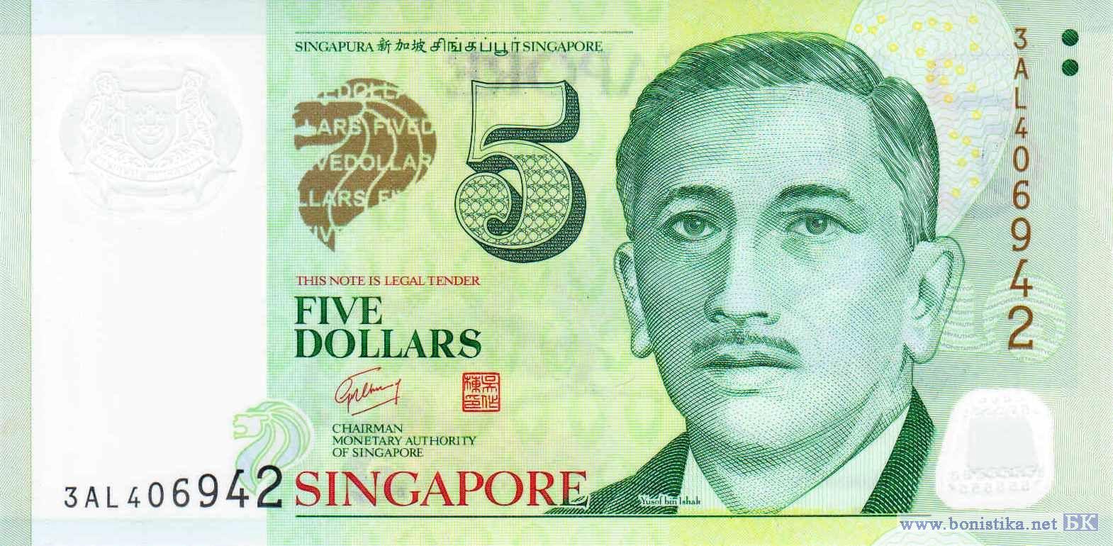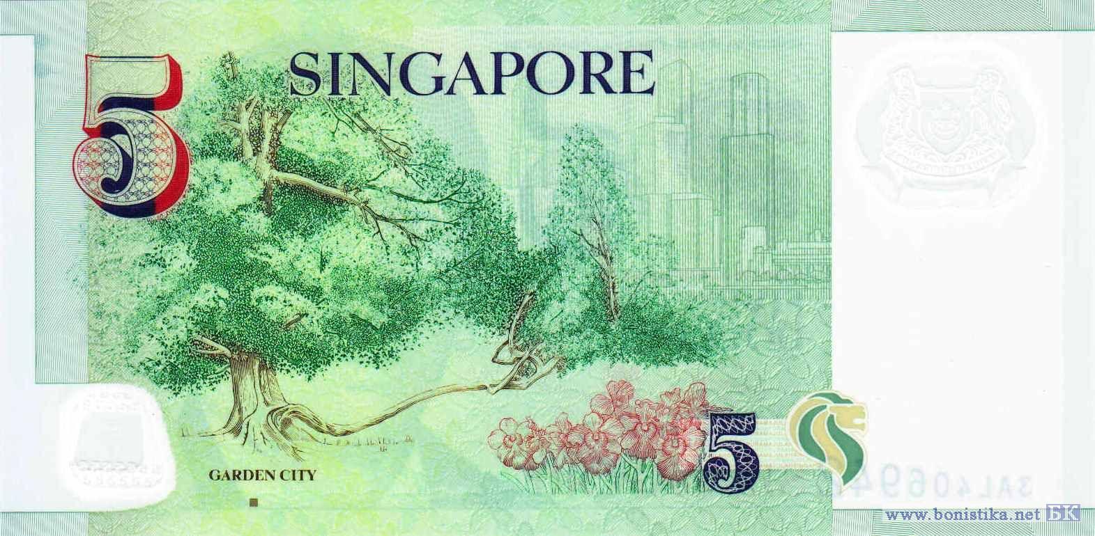 Журналист, губернатор, первый президент Юсоф бин Исхак. Двухсотлетнее тембусу (Fagraea fragrans) - вечнозелёное дерево семейства горечавковых, растущее в Сингапурских ботанических садах, стилизованное изображение высотных зданий в городе Сингапур, гибридные орхидеи Ванда мисс Джоаким (Vanda miss Joaquim) - национальный цветок Сингапура.