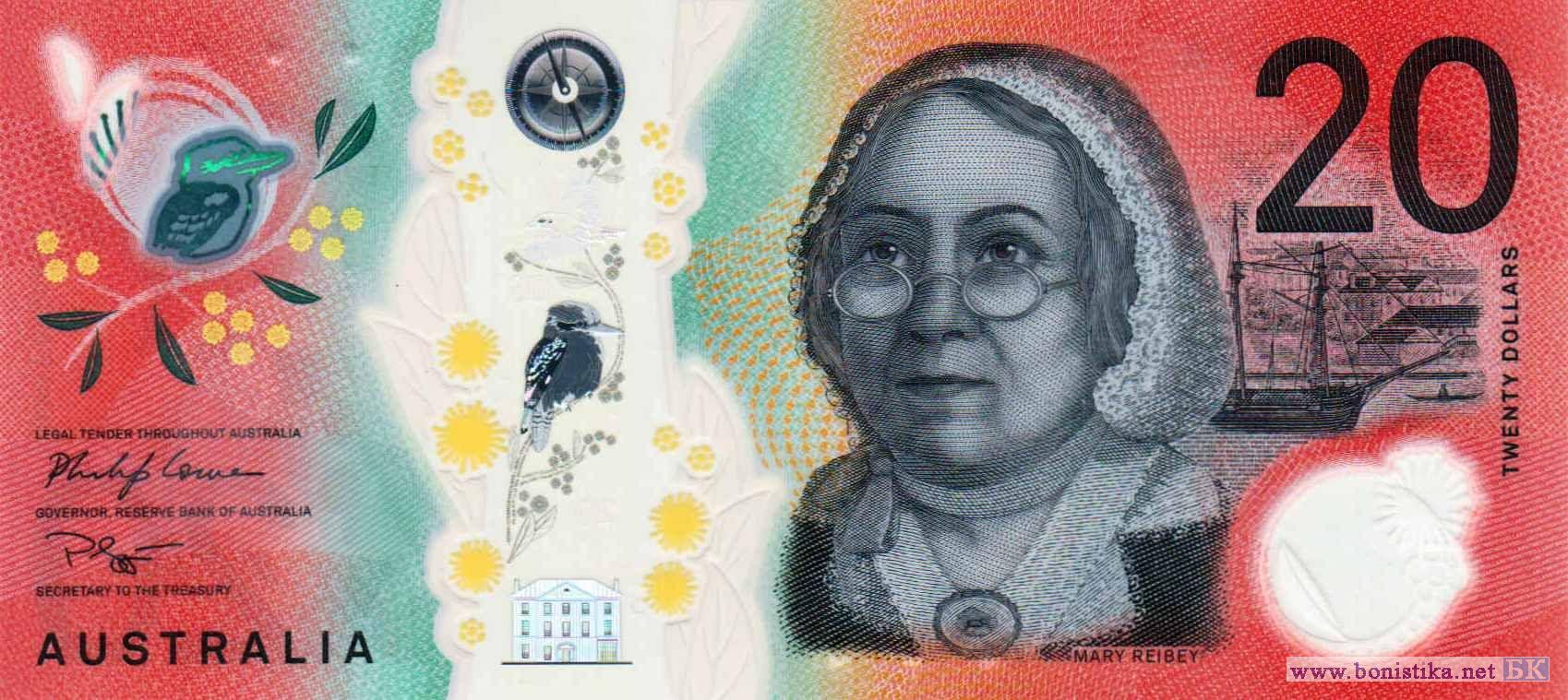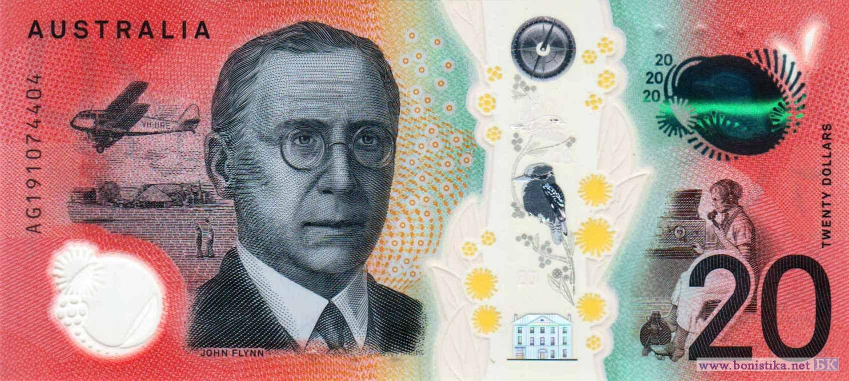 Ветви с соцветиями и листьями акации самшитолистной (Acacia buxifolia) – кустарникового дерева семейства бобовых, cмеющиеся кукабары или смеющиеся зимородки или зимородки-великаны (Dacelo novaeguineae) – птицы семейства зимородковых, компас, здания, бизнесвуман Мэри Рейби, шхуна «Меркури» в Сиднейской бухте в заливе Порт Джексон, деревья, рыбак в каноэ. Пассажирский двухмоторный биплан De Havillard DH.84 Dragon «L. M. Pattinson», здания и деревья на отдалённой усадьбе Брокен-Хилл в 1948 году, священник, основатель воздушной медицинской службы Джон Флинн, женщина-радиооператор трансиверной радиостанции с педальным приводом за работой.