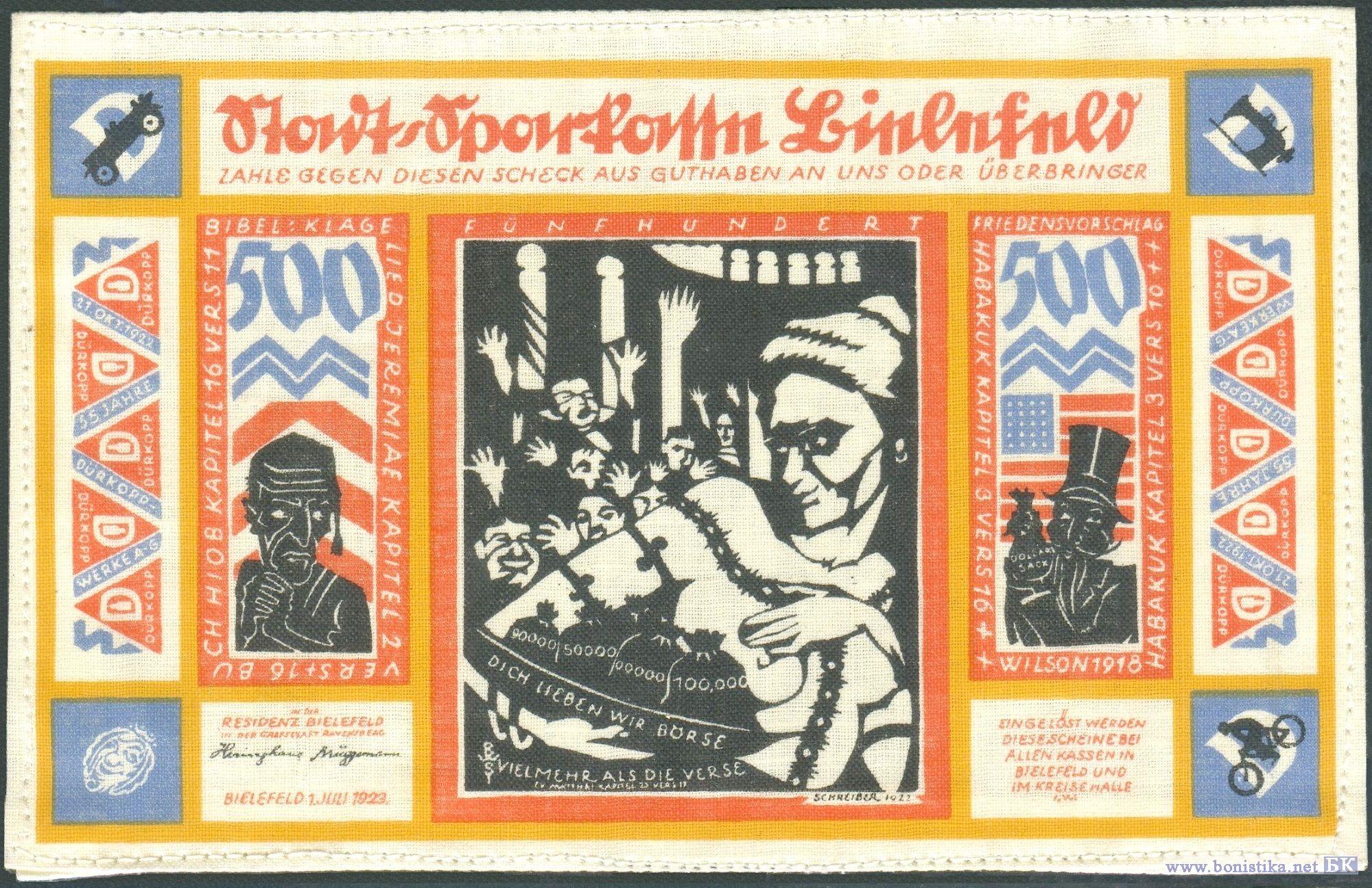 в центре фигура женщины с обнажённой грудью, несущая мешки с деньгами, за ней мужчины смотрящие на нее с вожделением, ниже текст: «Dich lieben wir börse, vielmehr als die verse» - «Мы любим больше кошелёк, а не стихи». Ниже, мелкими буквами - указание на стих 17 главы 23 из Евангелия от Матфея: "Безумные и слепые! Что больше: золото, или храм, освящающий золото?". Слева изображен бедняк, вокруг которого ссылки на стих 16 главы 2 книга Пророка Иеремии: "И сыновья Мемфиса и Тафны объели темя твоё" и стих 11 главы 16 книги Иова: "Предал меня Бог беззаконнику и в руки нечестивым бросил меня". Справа фигура президента Вудро Вильсона, держащего в руках «долларовый мешок». Вокруг него надпись - «Frieden vorschlag» - «Мирное предложение», «Wilson 1918» и ссылка на стих 16 главы 3 книги пророка Аввакума: "Я услышал, и вострепетала внутренность моя; при вести о сём задрожали губы мои, боль проникла в кости мои, и колеблется место подо мною; а я должен быть спокоен в день бедствия, когда придёт на народ мой грабитель его".