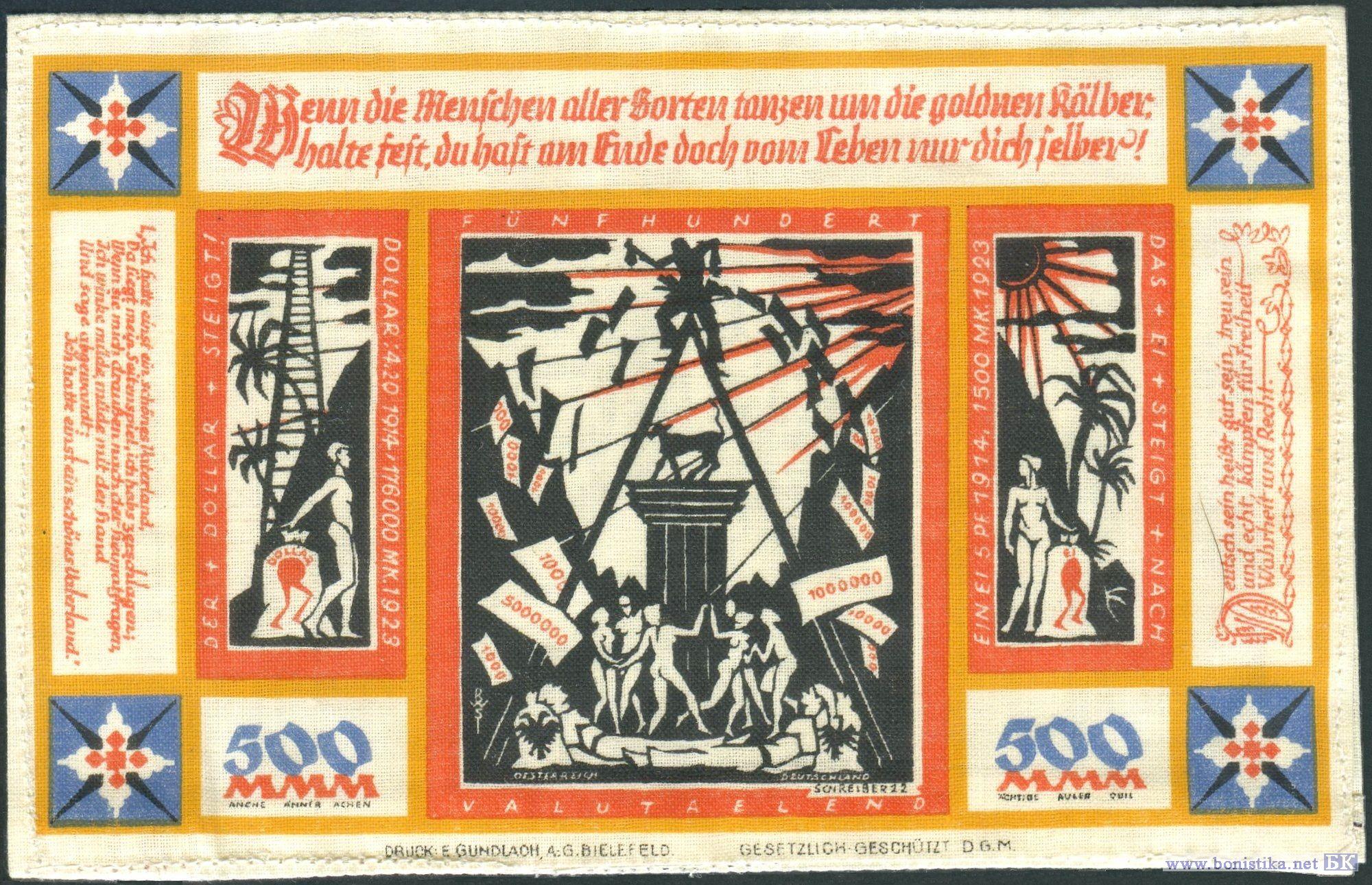 Справа - обнаженная фигура рядом с денежным мешком под солнечным небом. Вокруг фигуры написано: «Яйцо поднимается. 1 яйцо 5 пфеннигов 1914, 1500 марок 1923".