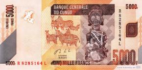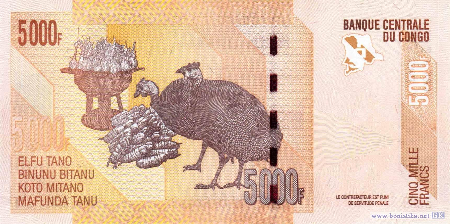 Стилизованное изображение очертания территории Конго, бурчелловы или саванные зебры (Equus quagga) - непарнокопытные млекопитающие семейства лошадиных, статуэтка народа хемба, монограмма Центрального банка. Мангал с мабоке (речной рыбой запечённой в банановых листьях), клубни маниока съедобного или кассавы, завёрнутые в банановые листья, индейки, стилизованное зеркальное изображение очертания территории Конго.