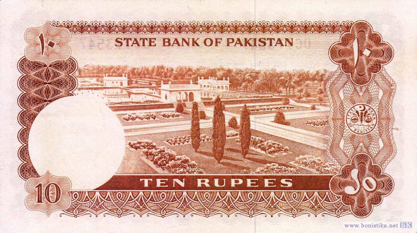 Лидер партии Мусульманская лига, первый генерал-губернатор Мухаммад Али Джинна. Деревья и здания в парке «Сады Шалимар» в городе Лахор в провинции Пенджаб, парк основан Великими Моголами, эмблема Государственного банка.