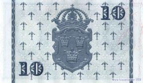 Фрагмент портрета короля Густава I Ваcы (Густава Эрикссона) работы немецкого художника Якоба Бинка. Повторяющиеся девизы на латыни «Надежность и безопасность» с эмблемы Шведского риксбанка, тре крунур (три короны) – национальные геральдические символы государственного герба Швеции и стилизованные снопы – символы королевской династии Васа, барельеф с изображением малого герба Швеции.