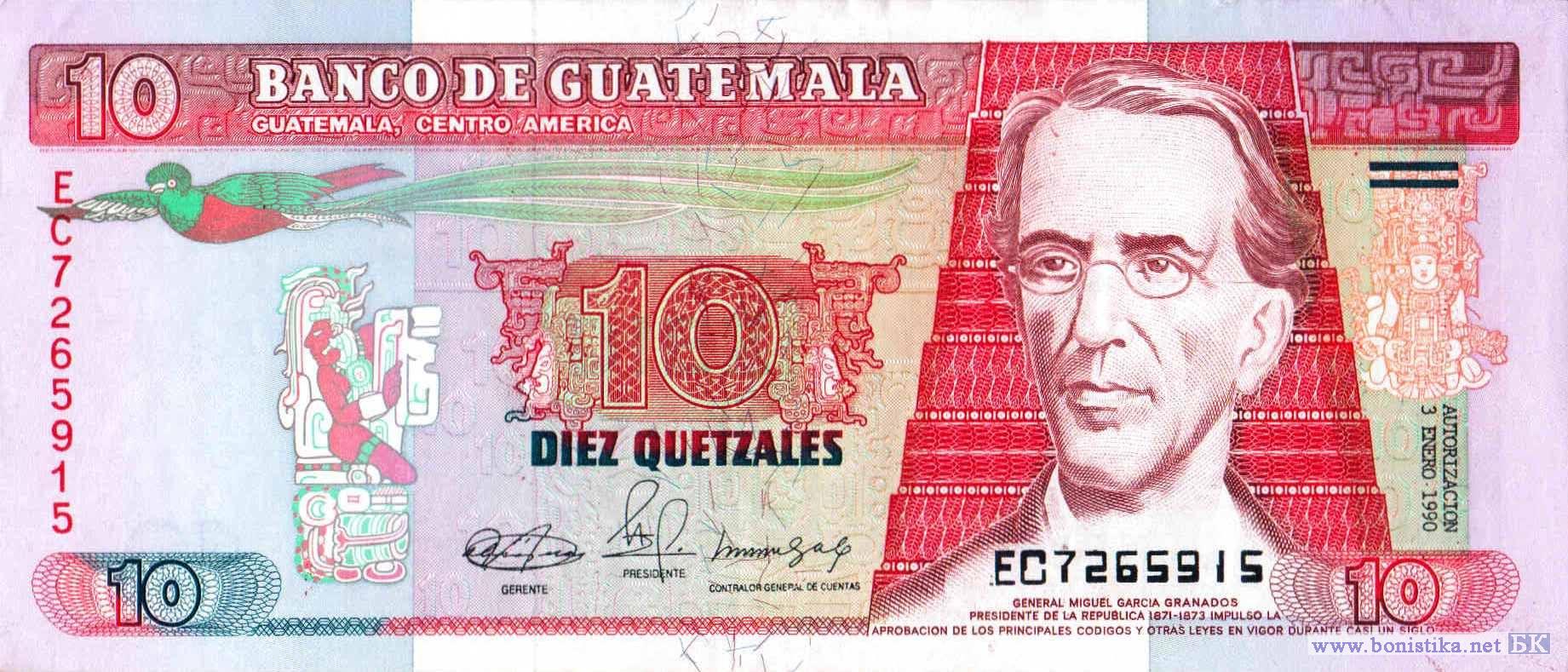 Фрагменты барельефов индейцев майя, летящий квезаль (Pharomachrus mocinno) – самая крупная птица семейства трогоновых, занесена в Международную Красную книгу, как вымирающий вид, является национальным символом Гватемалы, президент, генерал Мигель Гарсия Гранадос Савала. Фрагменты барельефов индейцев майя, сцена заседания национальной законодательной ассамблеи 1872 года.