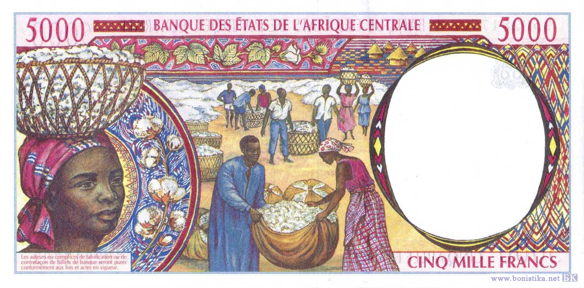 Морское судно, карта территорий государств Центральной Африки, нефтяные вышки, портрет рабочего в каске, фрагмент оборудования газового факела, сжигающего сопутствующий газ при добыче нефти, бурильщики за работой. Портрет женщины с корзиной с собранным хлопком на голове, ветвь хлопчатника обыкновенного или волосистого (Gossypium hirsutum) – растения семейства мальвовых, грузчики и упаковщики урожая хлопка, хижины.