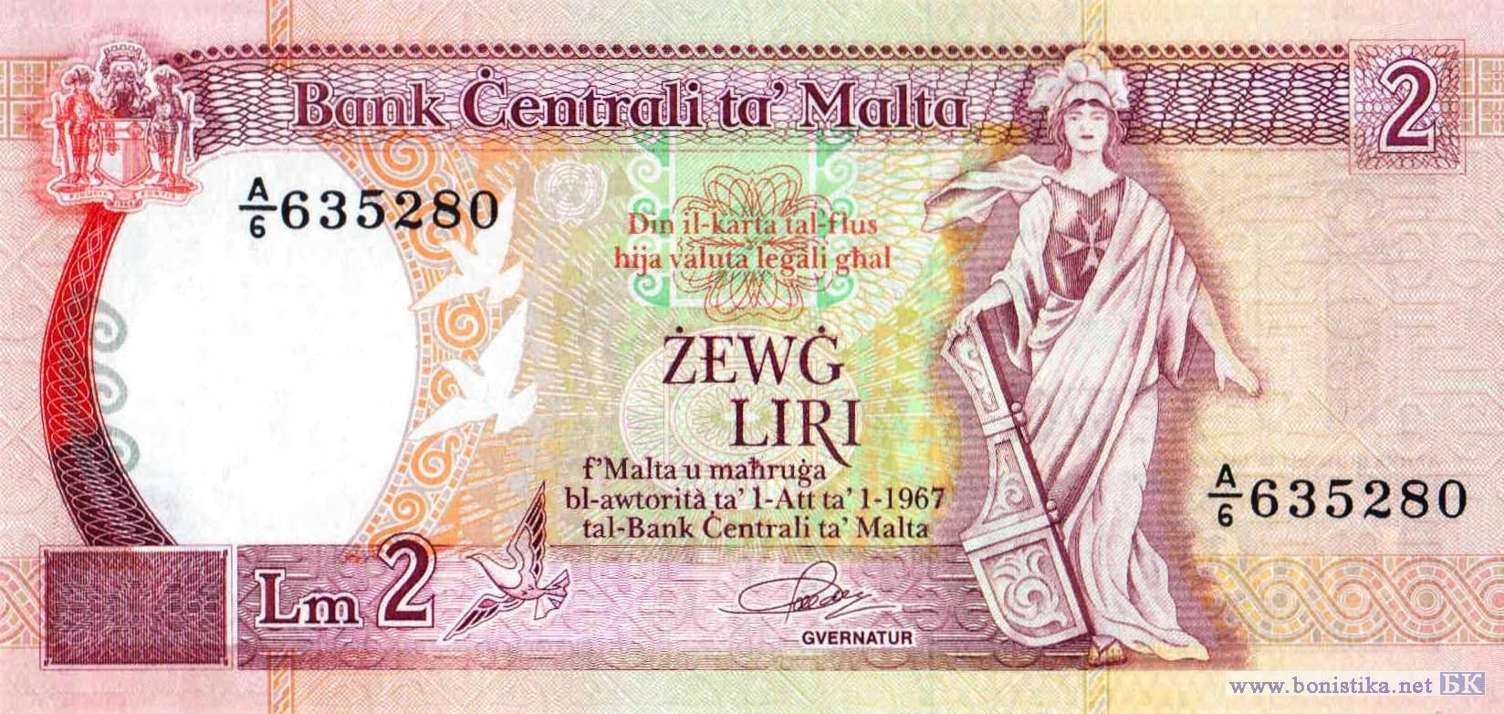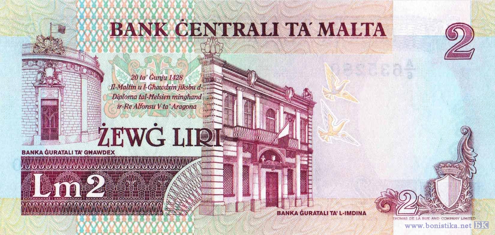 Герб Центрального банка Мальты, стилизованные изображения морских волн и летящих голубей, фрагменты древнеримских мозаик, эмблема Организации Объединённых Наций (ООН), Мелита с корабельным рулём в руке – аллегорическое женское олицетворение Мальты. Фрагмент фасада здания мэрии на площади Независимости в городе Виктория (Рабат) на острове Гоцо, гербы Мальтийского ордена и Великого магистра ордена госпитальеров Антониу Мануэла де Вильены, текст указа 20 июня 1428 года короля Арагона, Сицилии и Сардинии Альфонсо V Великодушного о даровании свободы Мальте и Гоцо, фасад муниципального здания в городе Мдина на острове Мальта, стилизованное изображение летящих голубей.