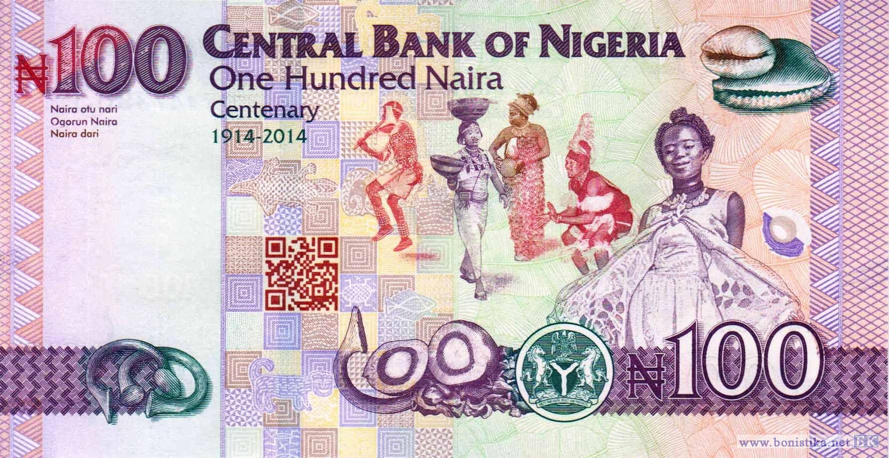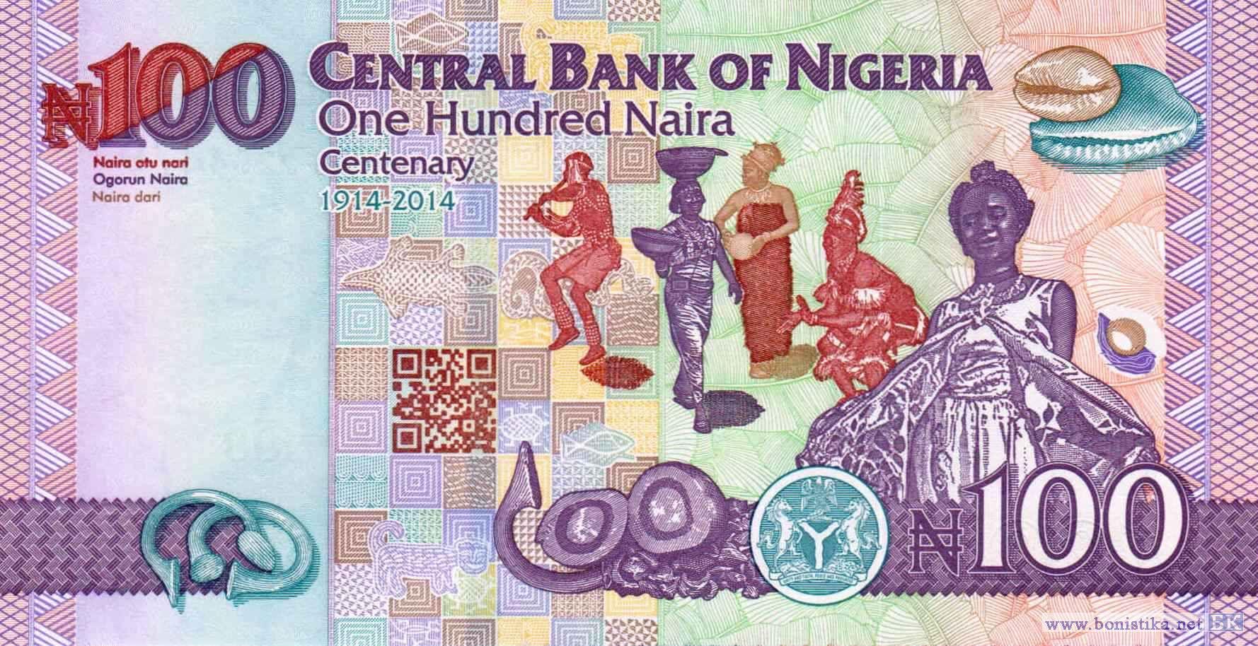 Юбилейная банкнота: 100-летие существования Нигерии. Государственный и политический деятель, министр финансов Обафеми Аволово, плоды кокосовой пальмы (Cocos nucifera) – растения семейства пальмовых (арековых), коробочка хлопчатника обыкновенного или волосистого (Gossypium hirsutum) – растения семейства мальвовых. Манилы – бронзовые браслеты, использовавшиеся как примитивные товарные деньги, традиционные музыканты и танцоры, женщина с сосудами на голове и в руке, раковины каури-монета (Monetaria moneta) – морских брюхоногих моллюсков семейства каури, использовавшихся в прошлом как примитивные товарные деньги.