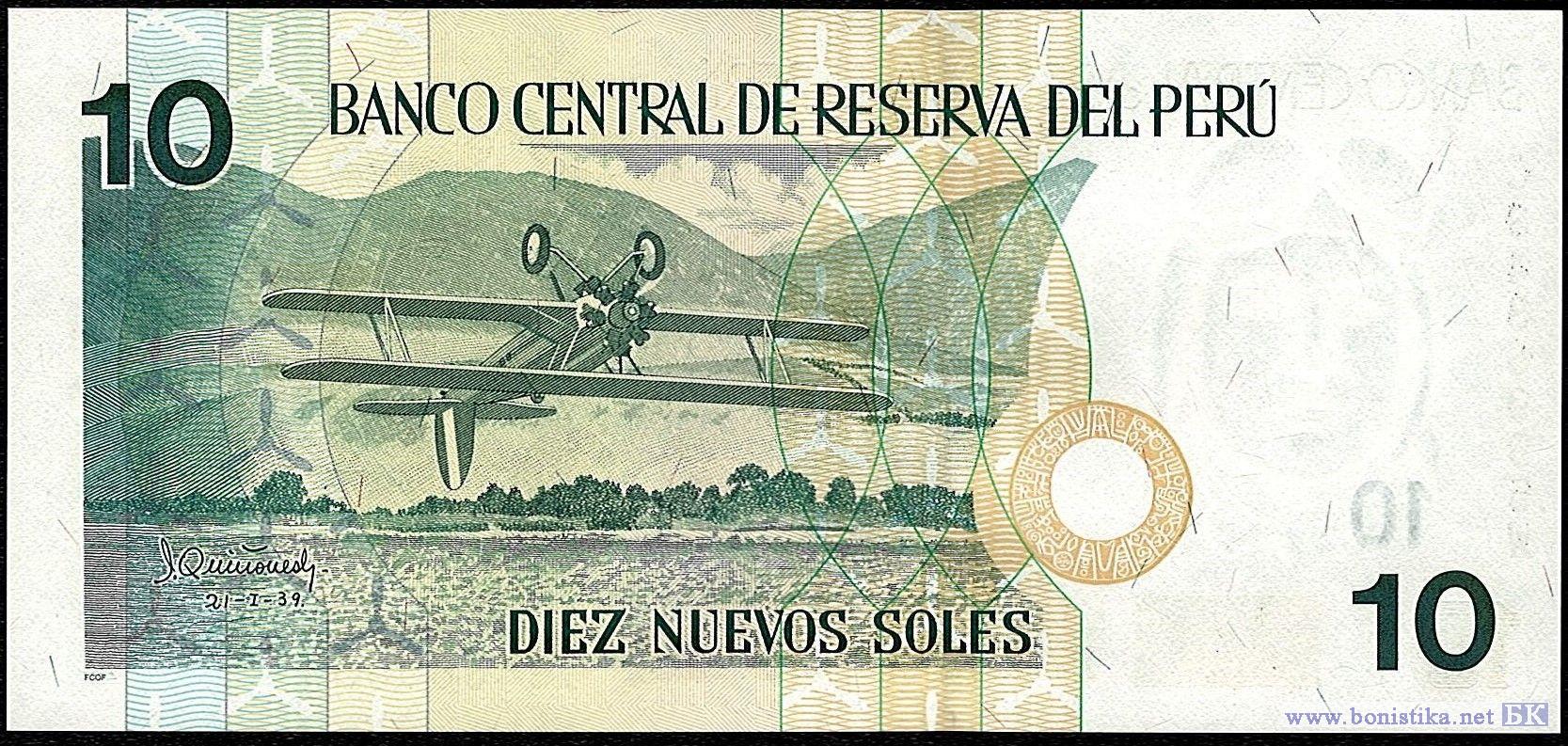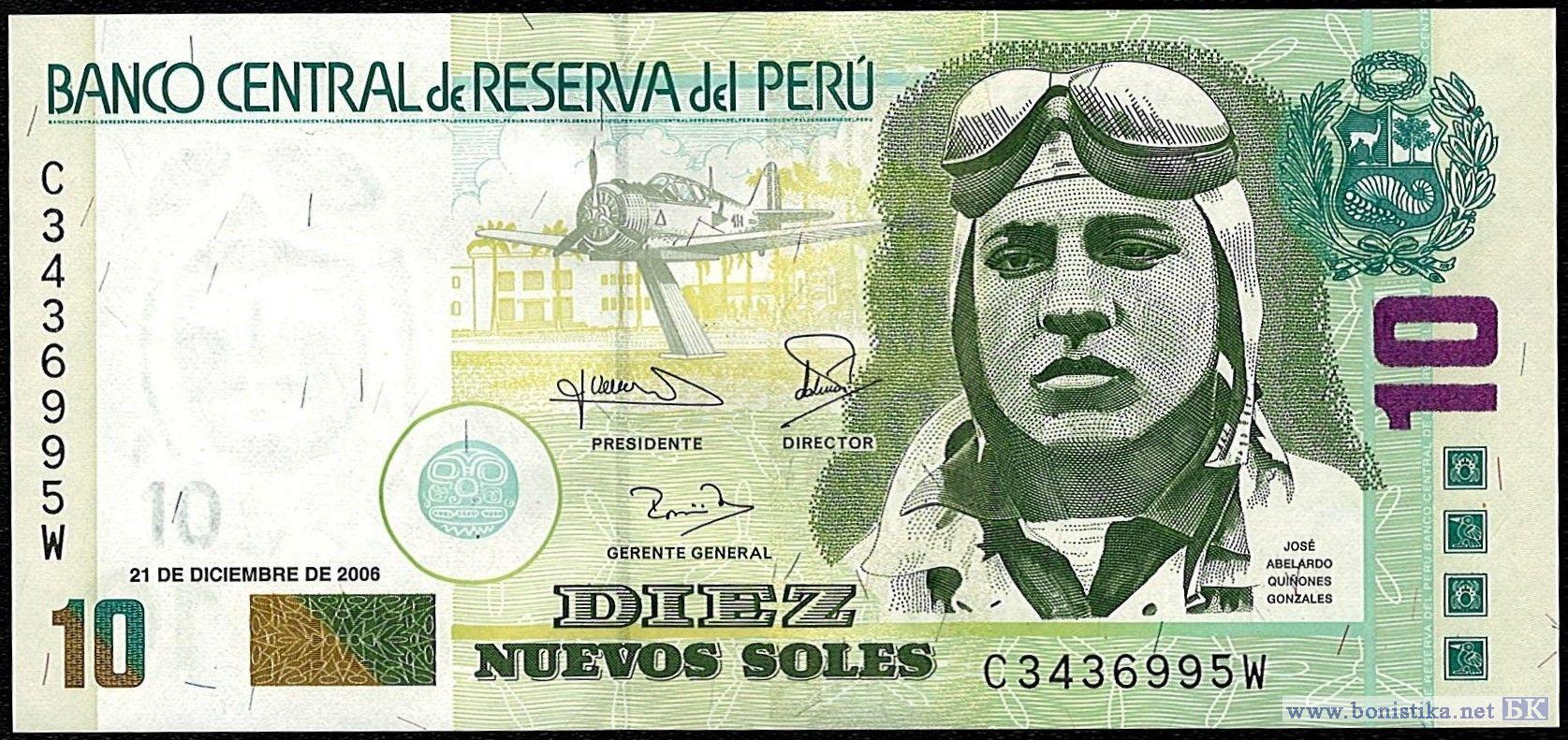 На аверсе - портрет национального героя Перу, военного лётчика Хосе Абелардо Киньонес Гонсалеса (1914 - 1941 гг.), участника Перуано-эквадорской войны 1941 г. Стал героем, направив 23 июля 1941 года свой подбитый самолёт на зенитную батарею противника и уничтожив её ценой своей жизни. На фоне – монумент истребитель North American NA-50A “Torito”