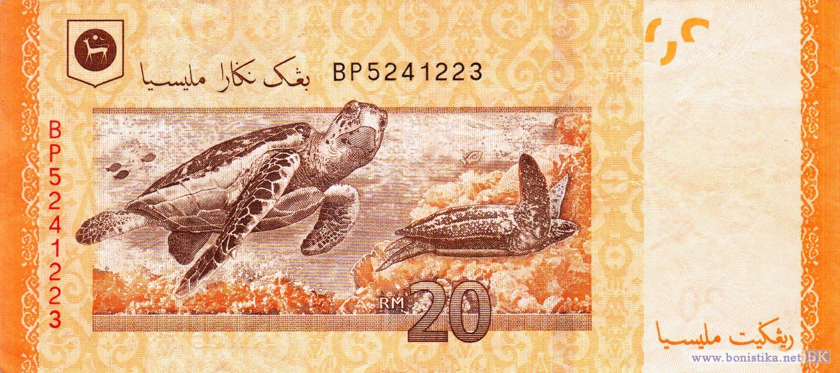 Листья и цветок бунга райя, или гибискуса китайского, или китайской розы (Hibiscus rosa-sinensis) – вечнозелёного кустарника семейства мальвовых, цветок является национальным символом Малайзии, путра (принц), первый премьер-министр Тунку Абдул Рахман Путра аль-Хадж ибни Альмархум Султан Абдул Хамид Халим Шах. Эмблема Центрального банка, рыбы, черепаха бисса или настоящая каретта (Eretmochelys imbricata) – позвоночное пресмыкающееся семейства морских черепах, кораллы, кожистая черепаха, или лут (Dermochelys coriacea) – позвоночное пресмыкающееся семейства кожистых черепах.