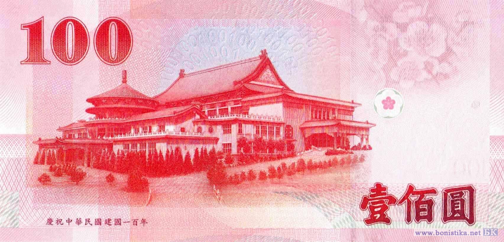 Юбилейная банкнота: 100-летие Китайской Республики. Фрагмент барельефа с изображением встречи Сунь Ятсена с народом, революционер, вождь Синьхайской революции, основатель партии Гоминьдан, «отец нации», первый президент Сунь Ятсен (Сунь Вэнь). Здание Чуньшан, в котором проходили заседания Национального собрания Республики Китай в мемориальном комплексе Сунь Ятсена в национальном парке Янминшань в городе Тайбэй, деревья, цветки китайской сливы, или муме, или мэйхуа (Prunus mume) – двудольного цветкового растения семейства розовых.