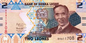Стилизованное изображение здания склада, пароход, один из лидеров международного профсоюзного и рабочего движения, журналист, политический деятель Исаак Теофилус Акунна Уоллес-Джонсон. Здание Банка Сьерра-Леоне в городе Фритаун.
