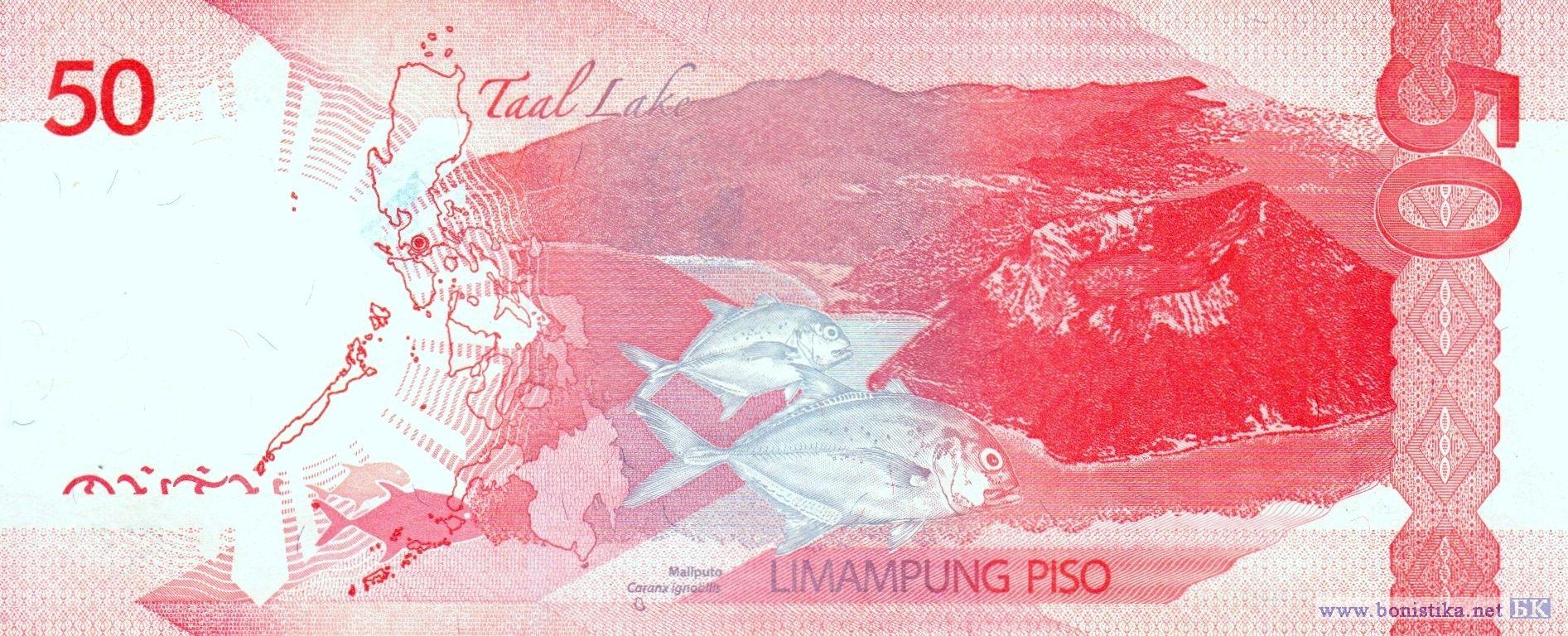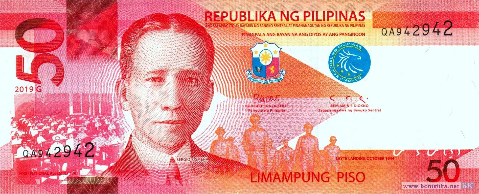 Фрагмент фотографии с изображением членов Национальной ассамблеи Филиппин 16 октября 1907 года – первого национального законодательного органа, полностью избранного путем общенациональных выборов, журналист, издатель, адвокат, окружной прокурор и губернатор провинции Себу, один из основателей Националистической партии, депутат Национальной ассамблеи, спикер и президент верхней палаты Национального парламента, министр образования, президент Серхио Осменья и Суико, фрагмент скульптурной группы, изображающей президента в изгнании Серхио Осменью, американского генерала Дугласа Макартура, американского генерал-лейтенанта Ричарда Керенса Сазерленда, бригадного генерала Карлоса Пенью Ромуло, американского генерал-майора Кортни Уитни, помощника и ординарца генерала Макартура сержанта Франсиско Сальверона, и корреспондента радиосети Си-Би-Эс (CBS) Уильяма Дж. Данна во время высадки морского десанта на пляже Рэд Бич в городе Пало на острове Лейте 20 октября 1944 года, монумент находится в мемориальном национальном парке Макартур-Лэндинг и является национальным историческим памятником, эмблема Центрального банка. Карта Филиппин, стратовулкан Макулот, вулкан Тааль и спящий кратер Бининтанг Малаки (Большая Нога) на пресноводном озере в кальдере Тааль в национальном парке вулкана Тааль в провинции Батангас на острове Лусон, желтопёрые каранксы (Caranx ignobilis) – морские лучепёрые рыбы семейства ставридовых, фрагмент узора ручной вышивки из провинции Батангас.