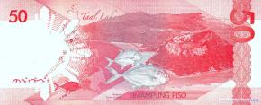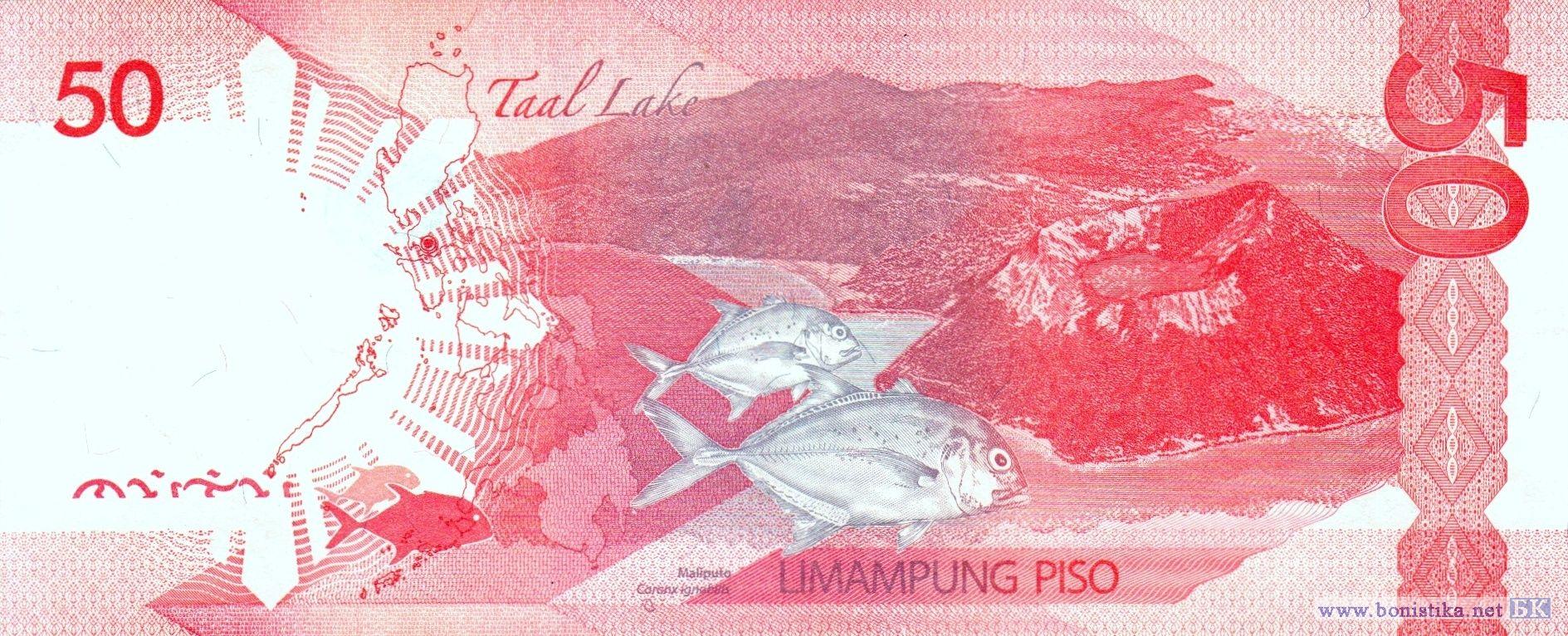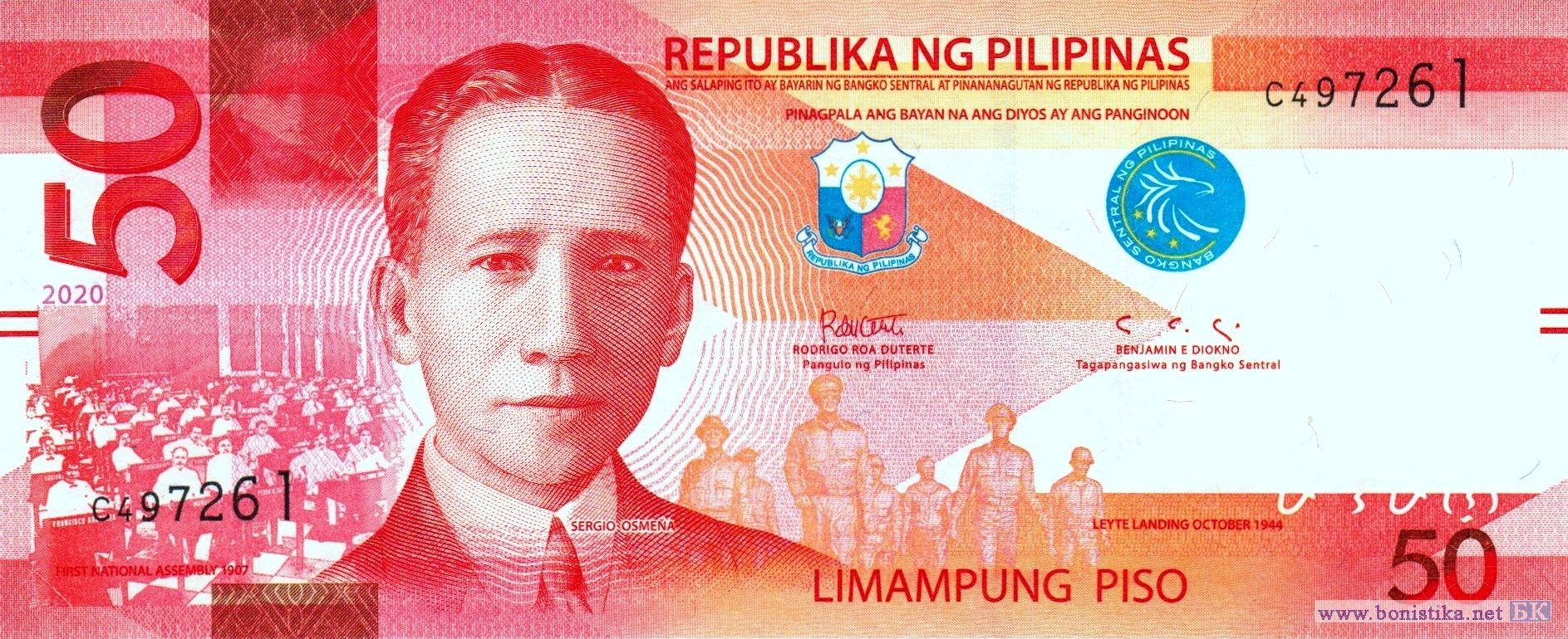 Фрагмент фотографии с изображением членов Национальной ассамблеи Филиппин 16 октября 1907 года – первого национального законодательного органа, полностью избранного путем общенациональных выборов, журналист, издатель, адвокат, окружной прокурор и губернатор провинции Себу, один из основателей Националистической партии, депутат Национальной ассамблеи, спикер и президент верхней палаты Национального парламента, министр образования, президент Серхио Осменья и Суико, фрагмент скульптурной группы, изображающей президента в изгнании Серхио Осменью, американского генерала Дугласа Макартура, американского генерал-лейтенанта Ричарда Керенса Сазерленда, бригадного генерала Карлоса Пенью Ромуло, американского генерал-майора Кортни Уитни, помощника и ординарца генерала Макартура сержанта Франсиско Сальверона, и корреспондента радиосети Си-Би-Эс (CBS) Уильяма Дж. Данна во время высадки морского десанта на пляже Рэд Бич в городе Пало на острове Лейте 20 октября 1944 года, монумент находится в мемориальном национальном парке Макартур-Лэндинг и является национальным историческим памятником, эмблема Центрального банка. Карта Филиппин, стратовулкан Макулот, вулкан Тааль и спящий кратер Бининтанг Малаки (Большая Нога) на пресноводном озере в кальдере Тааль в национальном парке вулкана Тааль в провинции Батангас на острове Лусон, желтопёрые каранксы (Caranx ignobilis) – морские лучепёрые рыбы семейства ставридовых, фрагмент узора ручной вышивки из провинции Батангас.