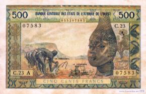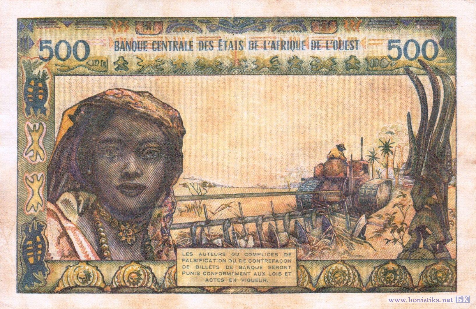 Тип е. Литера A выпуск для Кот-д'Ивуара. Лицевая сторона банкноты отпечатана металлографическим способом печати. Вариант подписей № 5: Mohamed Saleh M'Khaitirat - Robert Julienne. Без указания даты.