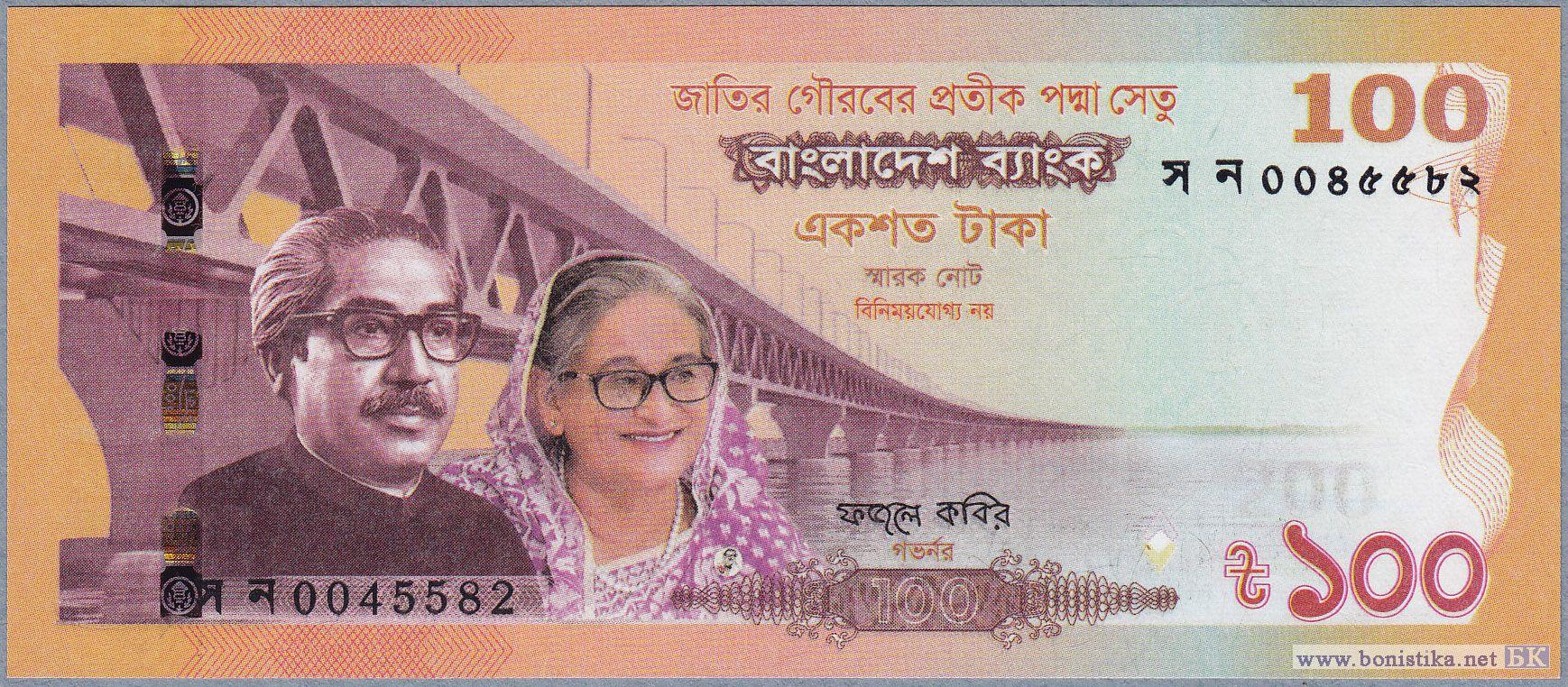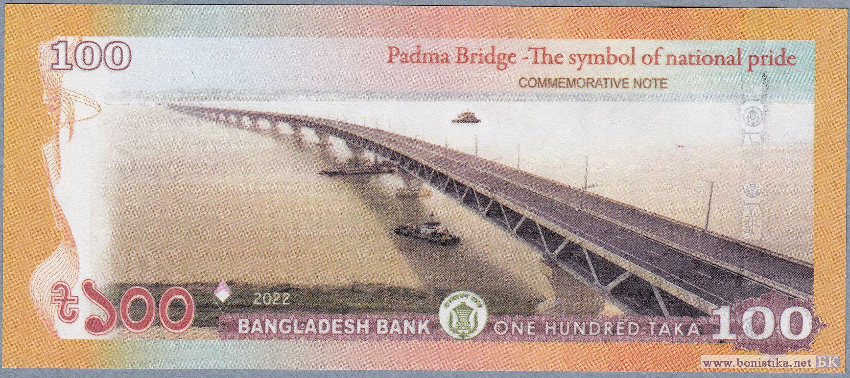 Памятная банкнота: Мост Падма - символ национальной гордости. Фрагмент многоцелевого моста через реку Падма, первый президент, премьер-министр, шейх Муджибур Рахман, убит в ходе военного переворота и премьер-министр, шейх Хасина Вазед. Многоцелевой мост через реку Падма, суда, эмблема Банка Бангладеш.