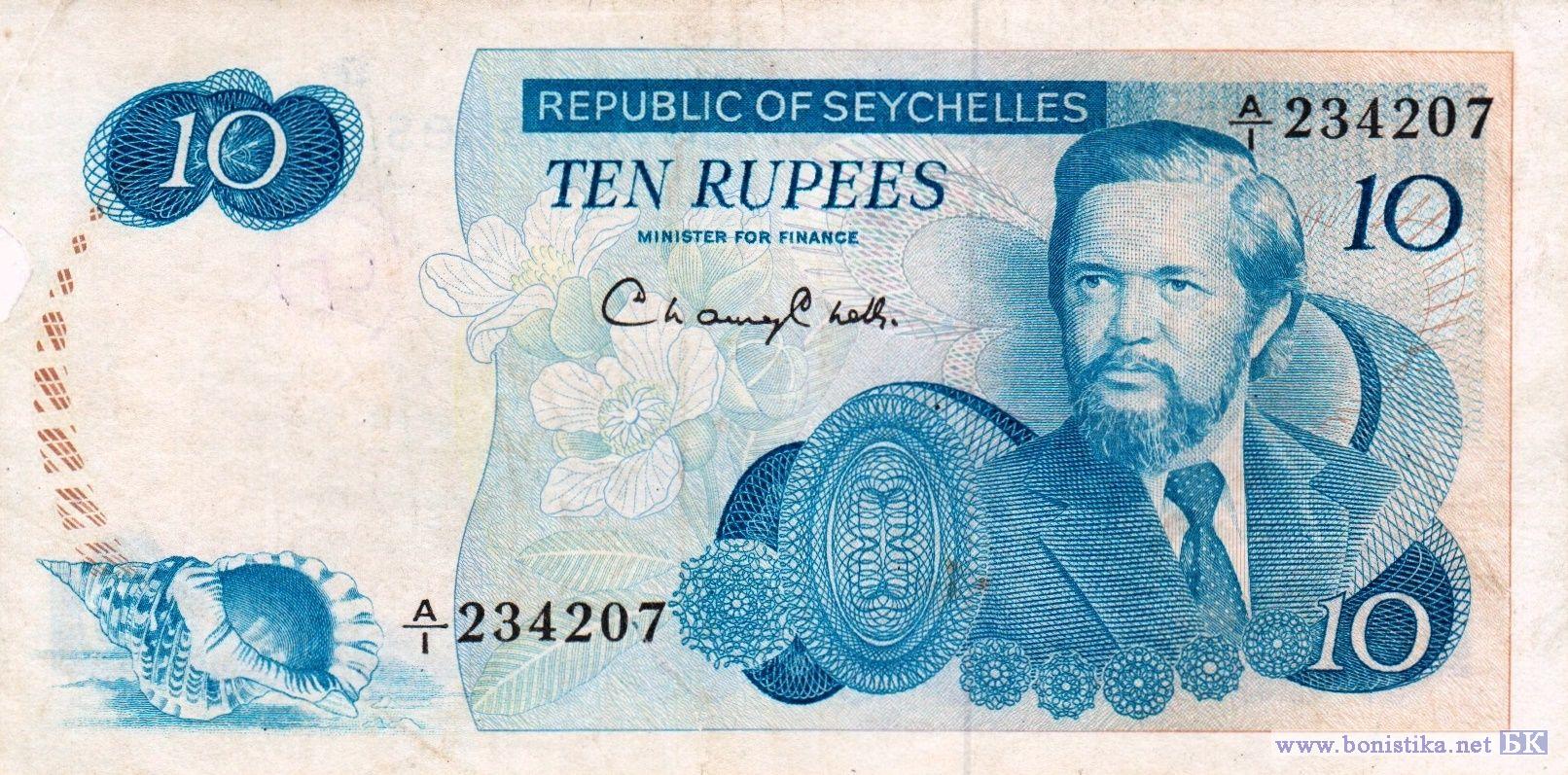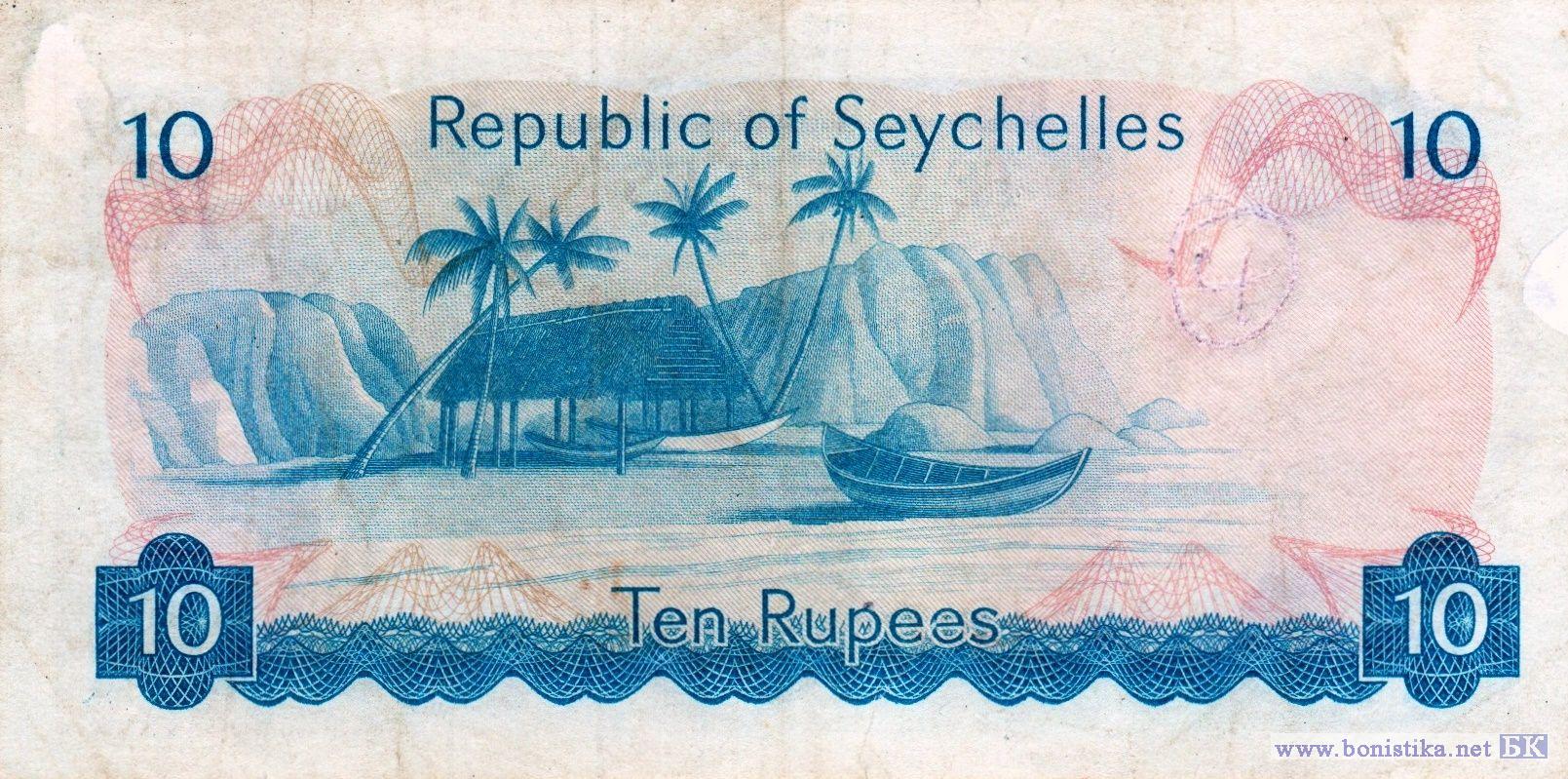 Раковина моллюска, цветы, первый президент Джеймс Ричард Мэри Мэнчем, свергнут в результате государственного переворота 5 июня 1977 года. Скалы, пальмы, навес, лодки на берегу.
