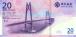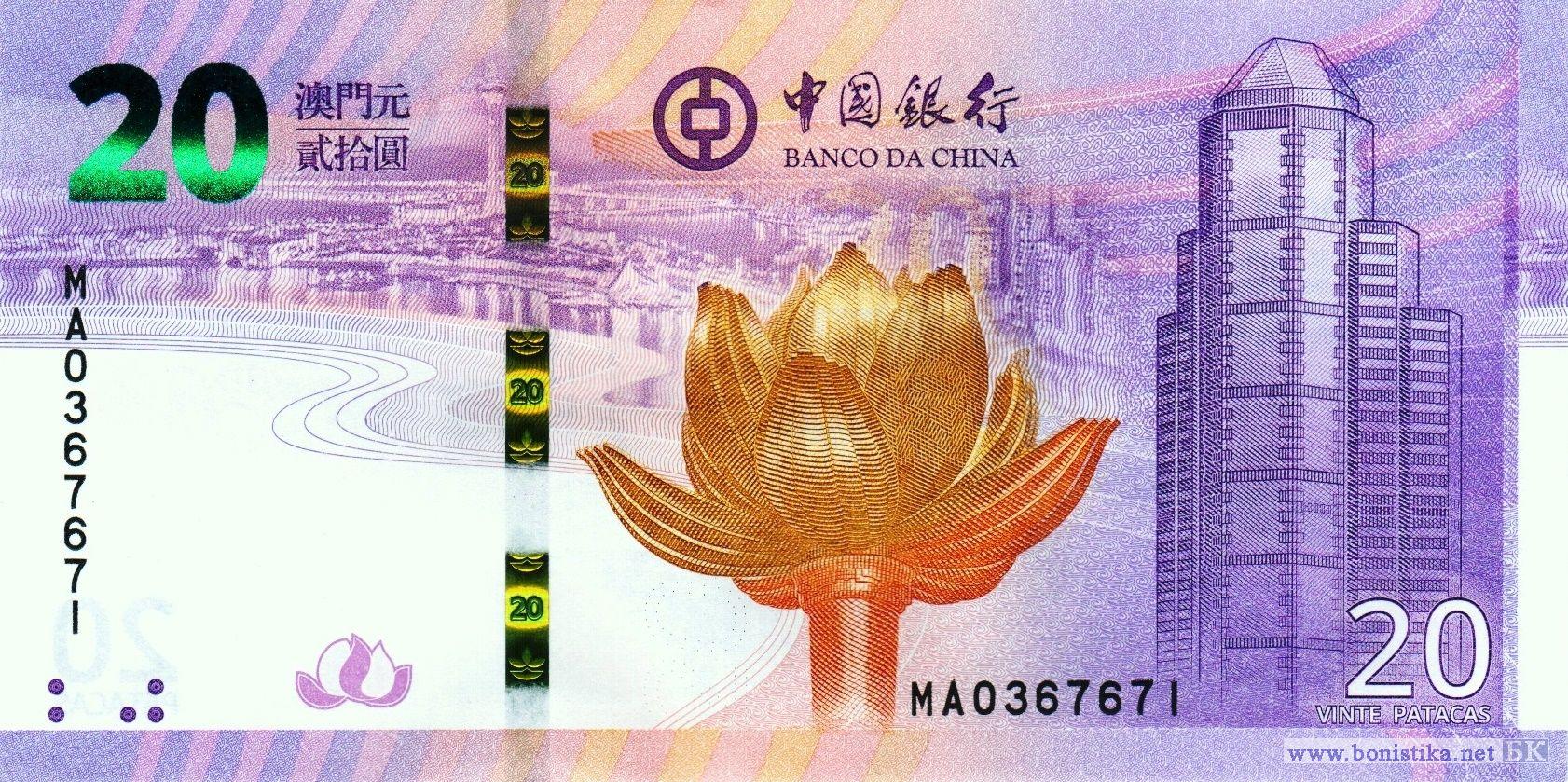 Памятная банкнота: 20-летие возвращения Макао Китаю. Вид города Аомынь, эмблема Банка Китая, фрагмент монумента в виде цветка лотоса на площади Золотого Лотоса в городе Аомынь, монумент создан в честь возвращения Макао Китаю в 1999 году, фрагмент здания Банка Китая в городе Аомынь. Здания, мост Сянган-Жухай-Аомынь, эмблема Банка Китая.