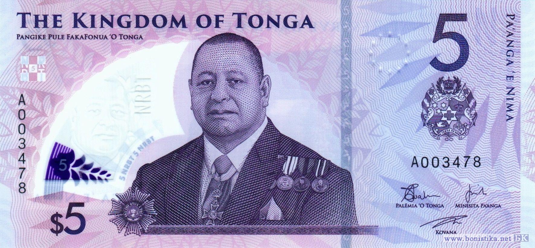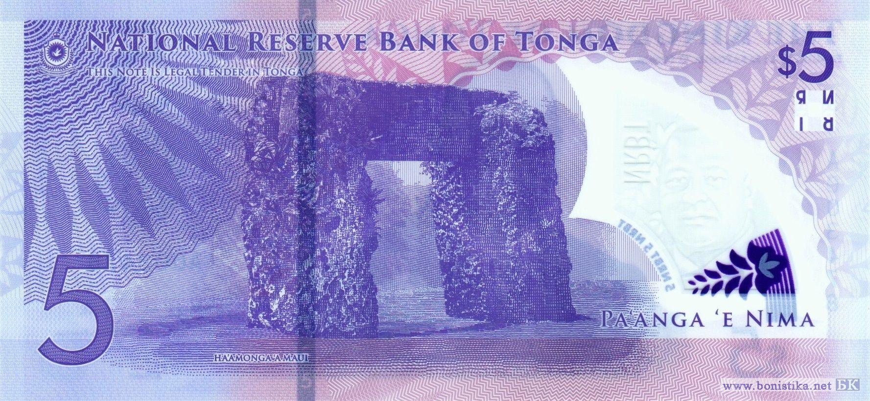 Орден, король Джордж Тупоу VI (Ахоэиту Унуакиотонга Тукуахо Тупоу VI). Эмблема Национального резервного банка, мегалитическая арка Хаамонга-а-Мауи (Ворота Тонга) на острове Тонгатапу.