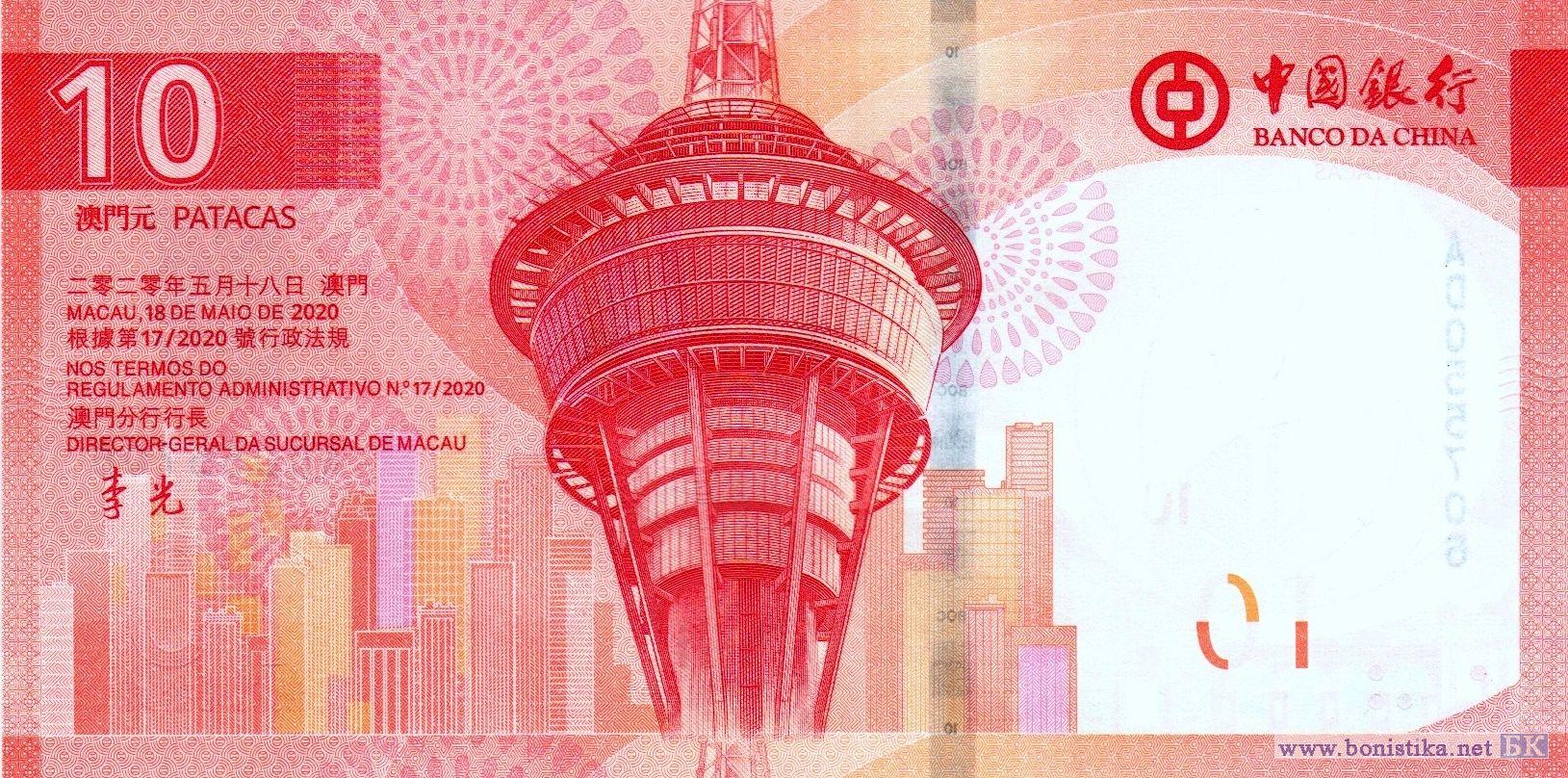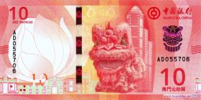 Стилизованное изображение цветка лотоса и зданий в городе Аомынь, маска фигуры льва, предназначенной для исполнения традиционного танца южного или гуандунского льва в период празднования Китайского нового года, фрагмент здания Банка Китая в городе Аомынь, эмблема Банка Китая, стилизованное изображение маски фигуры льва. Стилизованное изображение высотных зданий в городе Аомынь и праздничных салютов, фрагмент телебашни (Небесной башни) в городе Аомынь, эмблема Банка Китая.