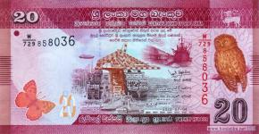 Бабочка баронет (Symphaedra nais) – членистоногое насекомое семейства нимфалид, современное судно-контейнеровоз у причала контейнерного терминала в порту города Коломбо, старые здания складов и грузовое судно у причала порта в городе Коломбо, цейлонская совка (Otus thilohoffmanni) – птица семейства совиных. Фрагмент сингальского цветочного орнамента лия вела, каменный барельеф с изображением пункаласы (ритуального сосуда изобилия) – символа процветания, фрагмент карты острова Шри-Ланка, музыкант с кандийским барабаном гета берая и танцор исполняющий классический кандийский танец вес нетума.