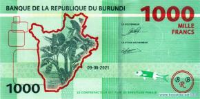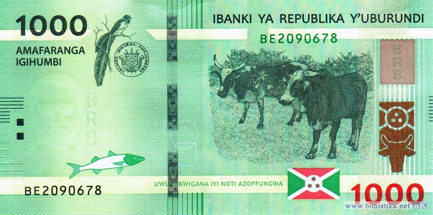 Самец райской вдовушки (Vidua paradisaea) – воробьинообразной птицы семейства вдовушковых, эмблема Банка Республики Бурунди, рыба, деревья, крупный рогатый скот, флаг Бурунди. Стилизованное изображение очертания территории Бурунди, стволы, листья и цветонос с плодами банана райского (Musa paradisiaca) – многолетнего травянистого растения семейства банановых, рыба, монограмма Банка Республики Бурунди.