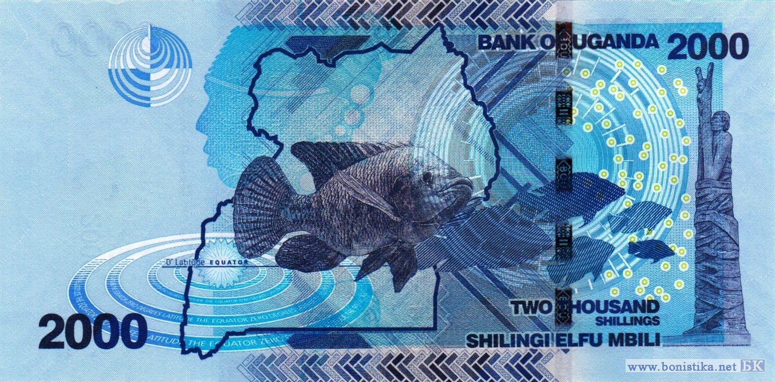 Стилизованное изображение профиля африканца, монумент у истока реки Нил в городе Ньеру в Центральном регионе, тропическая растительность на берегах реки Виктория-Нил, эмблема Банка Уганды. Стилизованные изображения профиля африканца и солнца, карта Уганды с обозначением экватора, нильские тиляпии (Oreochromis niloticus) – рыбы семейства цихловых, монумент Независимости в городе Кампала.