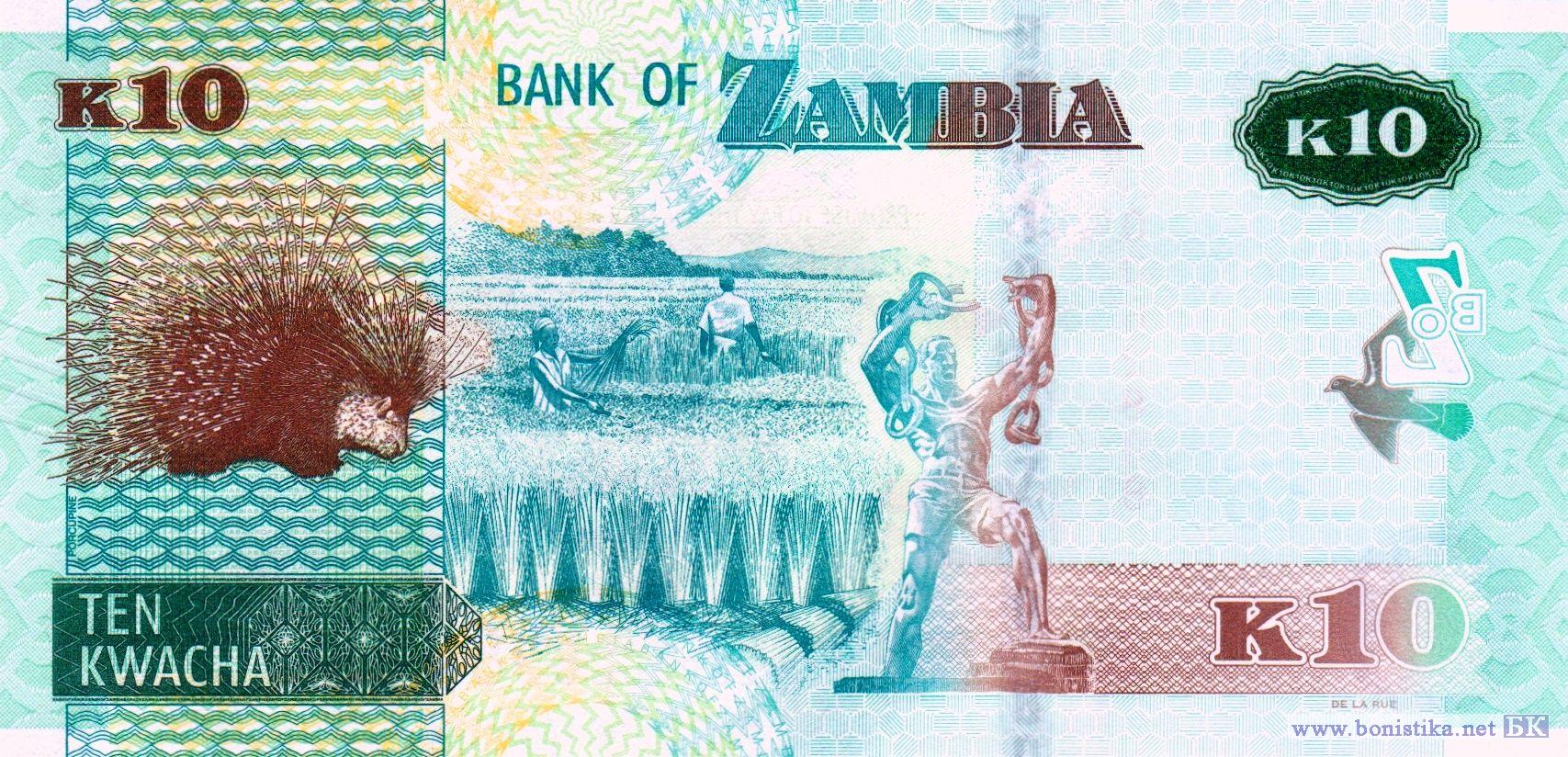 Аббревиатура Банка Замбии, летящий голубь, масуку (Uapaca kirkiana) – растения семейства филлантовых, орлан-крикун (Haliaeetus vocifer) –хищная птица семейства ястребиных. Южноафриканский дикобраз (Hystrix africaeaustralis) – грызун семейства дикобразовых, деревья, крестьяне на рисовом поле, горы, памятник «Свобода» в городе Лусака, летящий голубь, зеркальное отображение аббревиатуры Банка Замбии.