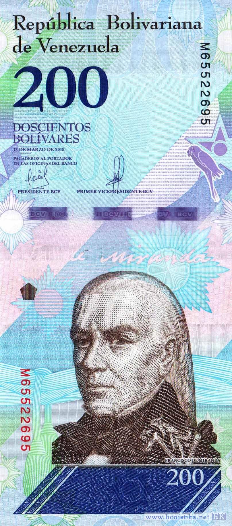 Стилизованные изображения орденов, национальный герой, революционер, руководитель борьбы за независимость, генералиссимус, автор флага Венесуэлы Себастьян Франсиско де Миранда и Родригес (Предтеча), умер в испанской тюрьме. Деревья в горах Кордильера-де-ла-Коста в Национальном парке Вараира Репано (Эль Авила) в городе Каракас, малые солдатские ары (Ara militaris) – птицы семейства попугаевых.