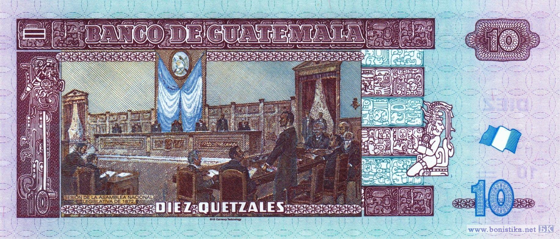 Фрагменты барельефов индейцев майя, летящий квезаль (Pharomachrus mocinno) – самая крупная птица семейства трогоновых, занесена в Международную Красную книгу, как вымирающий вид, является национальным символом Гватемалы, флаг Гватемалы, президент, генерал Мигель Гарсия Гранадос и Савала. Фрагменты барельефов индейцев майя, сцена заседания национальной законодательной ассамблеи 1872 года, флаг Гватемалы.
