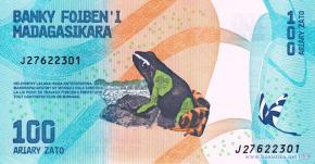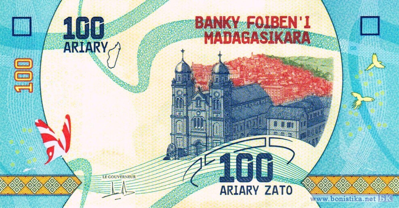 Стилизованное изображение бабочки, очертание острова Мадагаскар, кафедральный собор Амбозонтани и здания в городе Фианаранцуа, стилизованное изображение птиц. Лягушка чёрная мантелла, или мадагаскарская мантелла (Mantella baroni) – ядовитое земноводное семейства мантелловых, является эндемиком острова Мадагаскар, стилизованное изображение бабочки.