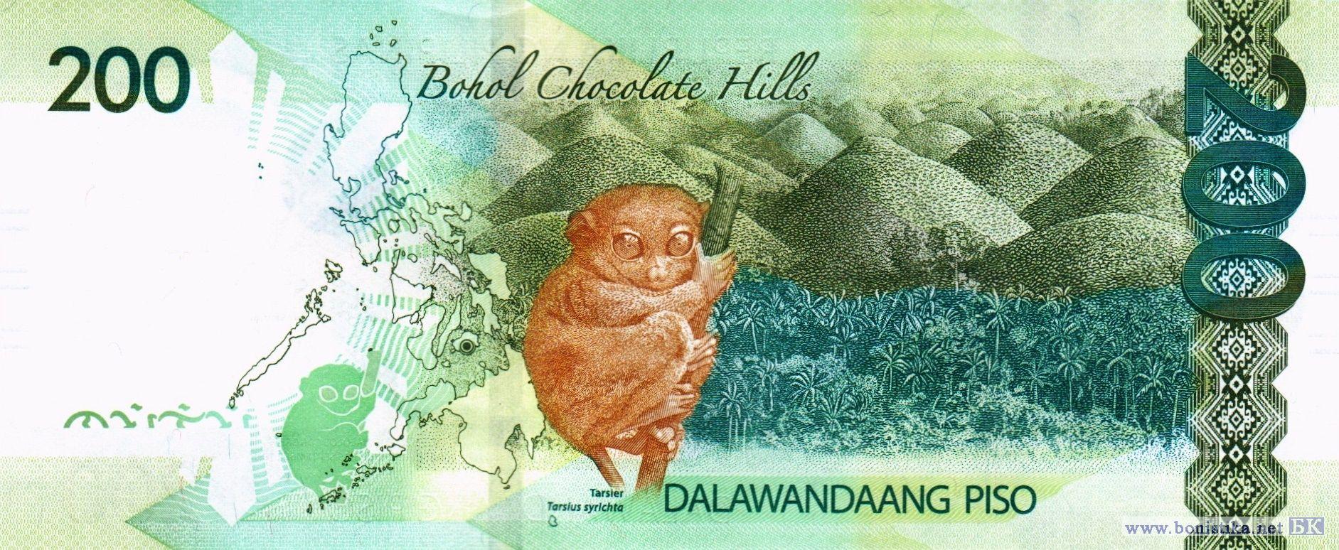 Сцена провозглашения независимости генералом Эмилио Агинальдо с балкона своего дома в муниципалитете Кавит 12 июня 1898 года, сцена приведения к присяге председателем Верховного суда Иларио Давиде президента Глории Макапагал-Арройо 20 января 2001 года, президент Диосдадо Панган Макапагал, участники открытия первого Конгресса Филиппин в католической церкви Барасоан в городе Малолос в провинции Булакан, эмблема Центрального банка. Карта Филиппин, Шоколадные холмы – конусообразные геологические образования в провинции Бохоль, филиппинский долгопят, или сирихта (Carlito syrichta) – примат семейства долгопятовых, пальмы, узор из района Висайских островов.